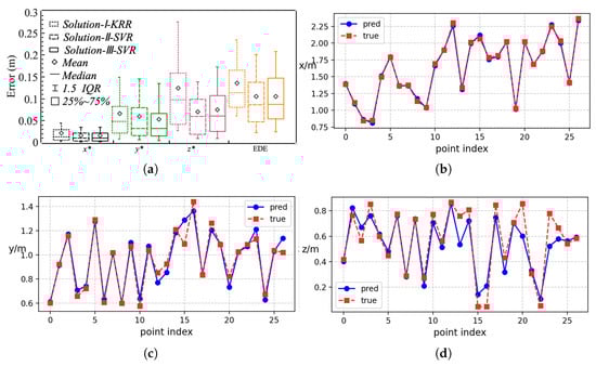 The results of the test samples: (a) Error of the source coordinates inferred by Solution-I-KRR, Solution-II-SVR, and Solution-III-SVR. (b) The true values and predicted values of the x-coordinates in the test set of the Solution-II-SVR model. (c) The true values and predicted values of the y-coordinates in the test set of the Solution-II-SVR model. (d) The true values and predicted values of the z-coordinates in the test set of the Solution-II-SVR model.