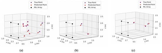 We have demonstrated the feasibility of our 3D sound source localization method through practical examples, and the model we constructed shows the same trend as the simulation experiments. SVR yields good fitting results in Solution-II and Solution-III. As can be seen from Figure 14b–d, in the test set, the coordinate values predicted by the model are highly consistent with the real coordinates. The predicted values of the x-coordinate are almost identical to the real values, which is also consistent with the previous conclusion.