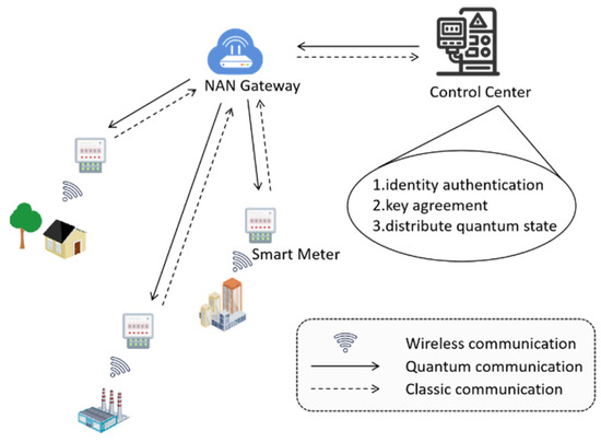 The smart grid model consists of SMs, gateways, and a CC. SMs are used to collect user side information and transmit power information to the CC through the aggregation function of gateways. The communication network of the smart grid has a hierarchical structure [26]. The user side area network is at the bottom layer and is composed of a variety of smart devices, and data is collected at the SMs. The data collected by SMs is aggregated at the gateways in the Neighborhood Area Network (NAN), and the aggregated data is submitted to the CC for data analysis. NAN gateways are intermediate nodes between SMs and the CC and also act as forwarding relays. Any message transmission between SMs and the CC, including classical messages and quantum messages, needs to pass through the transfer of NAN gateways. Therefore, it is necessary for the CC to conduct legitimacy inspection on their identities. Meanwhile, as an aggregation node of SMs, the NAN gateway needs to communicate securely with SMs. Thus, it is necessary to agree on a security key for an SM and a NAN gateway. In addition, in this paper, the CC is secure and trustworthy. It not only needs to be responsible for the identity authentication processing of SMs and NAN gateways but also needs to handle their registration requests. Meanwhile, the CC has complete quantum capabilities. Later, in the key agreement process between SMs and NAN gateways, it acts as an auxiliary third party to distribute necessary quantum states for both parties.