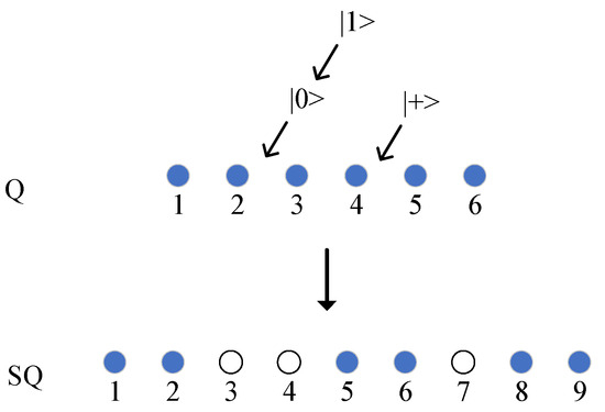 The CC generates decoy photons, and each quantum state is randomly selected from ; for example, is selected. The CC inserts the decoy photons into according to the first bits of to obtain the sequence . Assuming , the insertion result is shown in Figure 3. The CC records the decoy photons of each insertion position and sends the sequence to the NAN gateway.