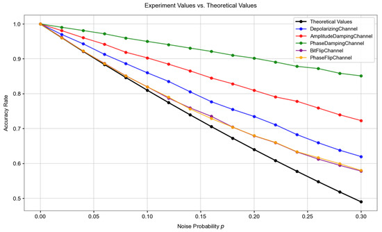We take this probability as the theoretical value of the probability that the scheme can still ensure correctness in a noisy environment. The results of the experimental correct probability and the theoretical correct probability under different noise environments are shown in the following Figure 4.