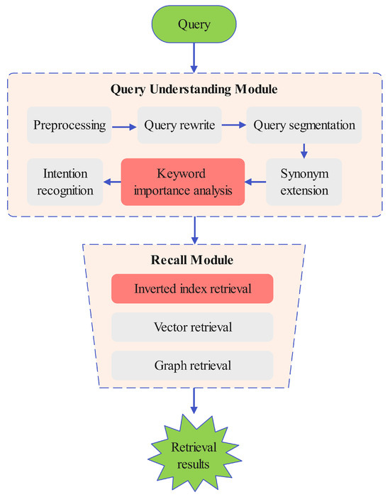 In this paper, we focus on the retrieval stage, which is a crucial stage within the entire search engine. Our goal is to improve the retrieval effectiveness of the retrieval stage, reducing the omission of valuable information during the initial screening process. In this way, the performance of the entire search engine can be enhanced, and the users’ search experience can be significantly enriched. The retrieval stage architecture in a search engine is described in Figure 1, which primarily consists of two core modules: the query understanding module and the recall module.