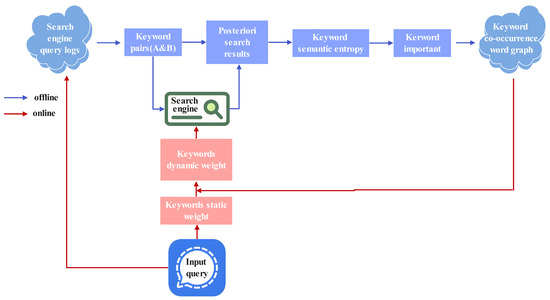 However, implementing these approaches revealed a key insight: the importance of query keywords is closely related to the corpus distribution. This suggests that leveraging the existing corpus to automatically determine keyword importance would be more effective. Therefore, we propose a semantic entropy-driven keyword importance analysis (SE-KIA) method, which associates search query logs, the search engine corpus, and semantic entropy. First, our method analyzes search query logs to identify user behavior patterns and extract domain-specific common keyword pairs. Next, with the help of the corpus, the posterior results of joint and separate searches of query keywords are obtained. This is because the corpus, a vital component of the retrieval system, encompasses extensive text data indexed and retrieved by the search engine, thereby offering a comprehensive context for comprehending the meanings and significance of words within the domain relevant to the search engine. Then, semantic entropy is applied to determine the relative importance of keywords in the keyword pairs. Finally, a co-occurrence keyword graph is constructed to dynamically weight query keywords online so as to improve the search engine’s ability to understand the users’ intention and improve the retrieval effectiveness. The SE-KIA method consists of both online and offline components, with their detailed implementations presented in Algorithms 1 and 2, respectively.