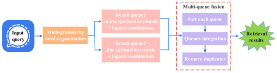 - Synonym expansion: Users have different expression habits. Through synonym expansion, words that are synonymous or nearly synonymous with the query term can be included in the retrieval scope. In addition, in some domains, the words used by users may not be the typical words that best express their needs [33]. Synonym expansion is helpful in uncovering users’ potential true intentions.