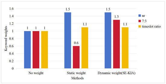 For example, for the query “nr 7:3 timeslot ratio”, our search engine will first segment the query into three keywords: “nr”, “7:3”, and “timeslot ratio”. The complete keyword weight assignment results are illustrated in Figure 5: (1) No weight: When no weighting scheme is applied, all keywords in the query are assigned equal weights, and the default weight is one. This approach fails to capture their relative importance, significantly limiting the system’s ability to prioritize relevant search results. (2) Static weight: When using only static weighting, the assigned weights for the keywords “nr”, “7:3”, and “timeslot ratio” are 1.5, 0.6, and 1.1, respectively. This weighting scheme fails to accurately capture the user’s search intent. The core keyword “7:3” is clearly the central focus of the timeslot ratio query, but it is systematically assigned a lower weight (0.6) due to its part-of-speech classification as a numerical term, despite its potential significance in specific queries. The “timeslot ratio”, as a domain phrase, gains relatively high weights (1.1) by default, causing it to dominate the search results. This results in the importance of the keyword “7:3” being significantly lower than the keyword “timeslot ratio”. This weighting imbalance leads to the retrieval of documents ranked at the top that only contain the keyword “timeslot ratio” but without the critical “7:3” specification, fundamentally failing to meet the user’s search intent. (3) Dynamic weight (SE-KIA): Our SE-KIA method will further adjust the keyword static weights based on the query context. It will query the pre-constructed keyword co-occurrence graph and identify “7:3” and “timeslot ratio” as a co-occurrence pair, with “7:3” showing higher relative importance. To better reflect this importance, SE-KIA dynamically adjusts the weight of “7:3” upward to the static weight of “timeslot ratio” plus the weight factor while maintaining the weights of other keywords. Finally, the weights of the keywords “nr”, “7:3”, and “timeslot ratio” are 1.5, 1.3, and 1.1, respectively. It can be seen that the relative importance of “7:3” in the query is enhanced. This adjustment ensures that the top-ranked retrieval results contain both “7:3” and “timeslot ratio”, accurately reflecting the user’s search intent. Case analysis results demonstrate that our SE-KIA method significantly enhances query understanding by dynamically capturing contextual relationships between query keywords and identifying their relative importance, thus achieving more precise document retrieval.