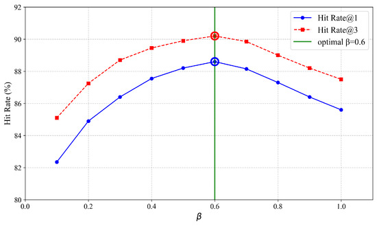 Our HRS-MSLC model integrates two key components: a multi-stage recall strategy and a logical combination recall strategy. For the multi-stage recall strategy, we examined the impact of the damping factor in Equation (12) on the overall retrieval performance by conducting a sensitivity analysis. The value of is varied from 0.1 to 1.0. As illustrated in Figure 6, the performance metrics HitRate@1 and HitRate@3 initially increase as rises from 0.1, reach an optimum around , and then subsequently decrease. This trend validates the necessity of incorporating : a value that is too small unduly suppresses the beneficial effect of subword expansion, while a value that is too large allows noisy subword matches to degrade the quality of the initial phrase-based retrieval. Through experimental validation, is established as the optimal value, effectively mitigating the issue where subword matches disproportionately dominate coarse-grained term results.