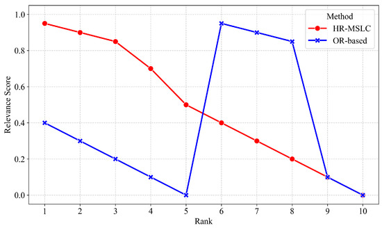 In the final retrieval results, since Queue1 has higher priority, documents containing the coarse-grained segmentation “aau5613” are ranked above those containing only the subword “aau” in the recall results, demonstrating the effectiveness of the multi-stage recall strategy. Additionally, the recall condition expression has a factor w for the AND-connected part, indicating that when documents match multiple AND-connected keywords, their recall score will be multiplied by the factor. Therefore, documents matching multiple AND-connected keywords simultaneously receive significantly higher recall scores and rank higher than those matching only a single keyword, improving the relevance of the top-ranked retrieved documents. This validates the effectiveness of the logical combination recall strategy. Figure 7 illustrates the relevance between the top 10 recall results and the target documents under different recall strategies. It can be observed that the OR-based method exhibited a significant sorting anomaly, where the document with the highest relevance score was mistakenly placed in the 6th to 8th positions, while the relevance of the top 5 results was not high. This is because this method provides higher scores to the documents when the subword “aau” appeared frequently, whereas our HR-MSLC model correctly prioritized precise phrase matching. It is evident that our HRS-MSLC model effectively addresses the problem of subword overshadowing and single-keyword matches, thereby enhancing retrieval effectiveness. This innovative design simultaneously ensures sufficient result quantity while significantly improving relevance, demonstrating clear advantages over baseline retrieval methods.