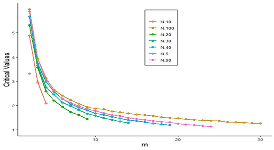 To address this challenge, we employed a Monte Carlo simulation approach. Specifically, 10,000 random samples of sizes were generated from the standard exponential distribution under the null hypothesis. For each sample size, we computed the -th quantile of the simulated values of to determine the critical values corresponding to significance levels and while varying the window size m from 2 to 30. Figure 1 and Figure 2 display the resulting critical values for each sample size and significance level. The critical values of the proposed test statistic at the significance level α=0.01 are presented in Figure 3, which serve as the basis for evaluating the power performance through Monte Carlo simulations.