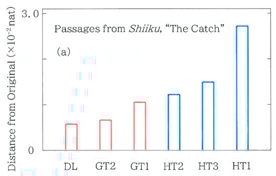 Throughout this paper we have concentrated on the 4-bit binary coding because this code length provides the upper limit for the lengths of our binary sequences with 310 < n < 1430 (Figure 3, Figure 4, Figure 5, Figure 6 and Figure 7). In other words, for our examples the chi-square testing is not applicable to the coding longer than four. In this section, computed results will be given for the 3-bit coding to investigate the robustness of our results for the 4-bit coding. First, we will revisit the results of Figure 3b for the 4-bit coding. For the 3-bit coding being made we have obtained χ2 = 2.372 (for HI2), 2.948 (DL), 3.286 (GT2), 6.248 (GT1), 6.734 (HI3), and 11.694 (HI1). Here, the critical chi-square value for α = 0.05 is 14.067. Note that the value of HI2, which was blank in Figure 3b, shows the value smaller than that of DL, but for the other five the ranking of the chi-square value remains the same as that seen in Figure 3b. Similar calculations on Figure 4b using the 3-bit coding have shown χ2 = 1.665 (for DeepL), 11.786 (Ikeda), and 14.245 (Google). Note that although the ranking changes places between Google and Ikeda, the results of the 3-bit coding share, with those of the 4-bit counterpart, the fact that the chi-square value for DeepL becomes substantially smaller than those of the other two.