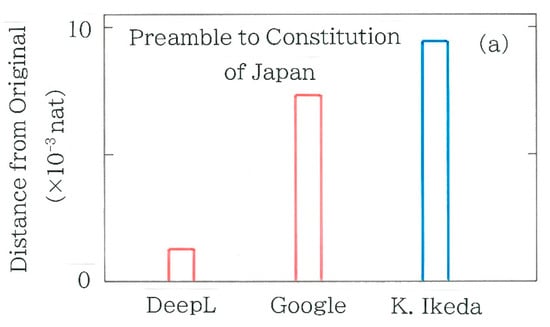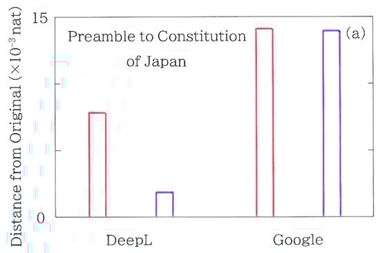 Experimental results of the Hellinger distance and the chi-square value are shown in Figure 7a,b, respectively, where the bars enclosed in crimson indicate the divergence from Ikeda’s original Text JI, while those enclosed in purple indicate the one from the authentic original, i.e., the Japanese version of the Preamble to the Constitution of Japan. It is found that for both Japanese originals the metrics of DeepL become considerably smaller than those of Google Translate. The results of Figure 7b show that the differences between Text JDL and the originals are not statistically significant (α = 0.05), whereas the ones between Text JGT and the originals are significant (α = 0.001).