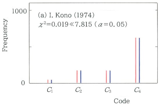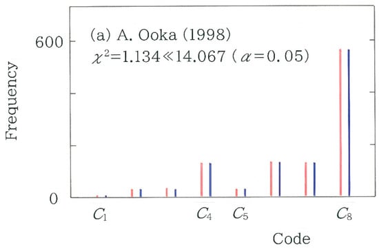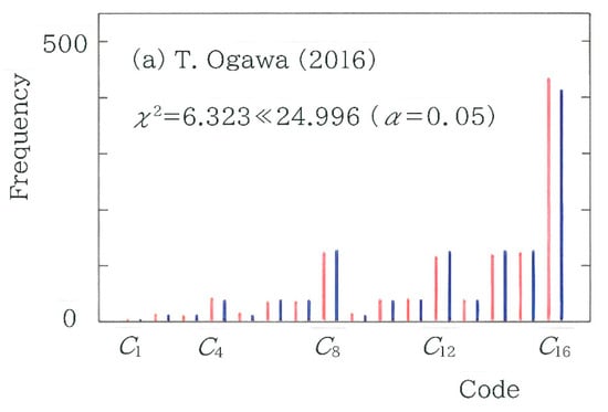 To explicitly visualize the difference between the surveyed and expected frequency, in Figure 6, frequency distributions of the 4-bit binary codes Ci (i = 1 to 16) are compared with red (surveyed) and navy (expected). Here, from Figure 5 the two bars on the left and right extremes are chosen: (a) Takayoshi Ogawa [53] (χ2 = 6.323; n = 1216) and (b) Saiichi Maruya [50] (χ2 = 81.610; n = 1216). Evidently, it is found that the difference in the topography is consistent with that of the chi-square value. That is, in Figure 6b the sequence of the twin bars consisting of red and navy exhibits a rough topography in particular on the right, which shows a sharp contrast to the relatively smooth topographic configuration being observed in Figure 6a.