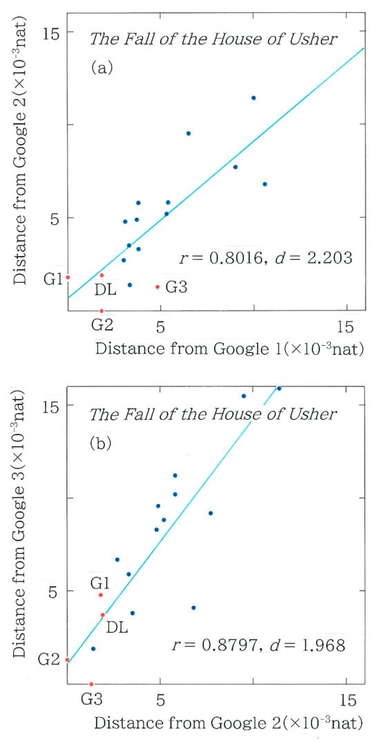 To conduct a diachronic analysis of the machine translations, in Figure 8 the relation is plotted between the two Hellinger distances for Japanese translations of the passages from The Fall of the House of Usher by Edgar Allan Poe [40]. The acronyms DL and G indicate DeepL (as of May 2025) and Google Translate, respectively; the number attached to G specifies the date of each machine translation: G1 (as of December 2023), G2 (as of January 2025), and G3 (as of July 2025). It can be seen that irrespective of the translation date, there is a moderate positive correlation (0.78 < r < 0.88) between the two distances, and of the 13 human dots in blue, the results of Tanizaki [41] are sited in the nearest region from the origin (0, 0). In particular, in Figure 8b the radius of this translator from the origin is much smaller than that of one of Google Translate (G1) as well as DeepL (DL).