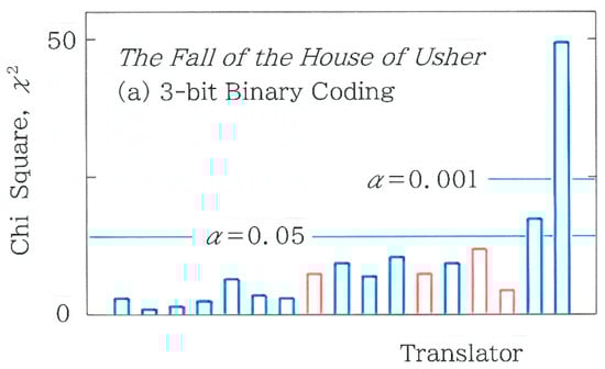 Subsequently, we will revisit the results of Figure 5, where for the 4-bit coding, comparison was made among chi-square values for 17 Japanese translations of the opening paragraph. The results of the 3-bit coding are shown in Figure 10a. Here, the blue and red bars indicate the human and machine translations, respectively. In applying Equation (4) with m = 8, instead of Equation (5), the expected frequencies Fi (i = 1 to 8) for C1 = 000, C2 = 001, C3 = 010, C4 = 011, C5 = 100, C6 = 101, C7 = 110, and C8 = 111 are obtained with the mixture of ‘0’ and ‘1’ in the entire binary sequence: