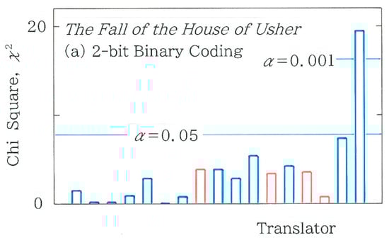 Here, M and N, respectively, are the total of ‘0’ and the grand total of ‘0’ and ‘1’. Note that for the 4-bit coding N = 4 (n – 3). As for the machine translations (red bars) in Figure 5, in order from the left to the right, one can see Google Translate 1 (GT1 in short; as of December 2023; χ2 = 14.957), GT2 (as of May 2025; χ2 = 21.735), DeepL (as of July 2025; χ2 = 23.936), and GT3 (as of July 2025; χ2 = 25.517). It is interesting to note that the three bars of GT2, DeepL, and GT3 exhibit a height comparable to each other, but solely for GT3 the null hypothesis is rejected (α = 0.05). As for the human translations (blue bars), of the 13 translations, only 2 on the right extreme, which correspond to Matsumura [42] (χ2 = 40.308) and Maruya [50] (χ2 = 81.610), are found to be statistically significant (α = 0.001). It should be stressed here that Saiichi Maruya (1925–2012), who received a Cultural Medal in 2011, is well known not only as a translator of Ulysses by James Joyce (1882–1941) but also as a writer of his unique rules for kana usage.