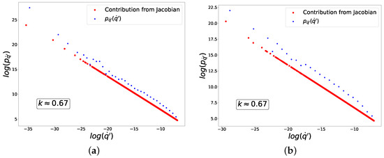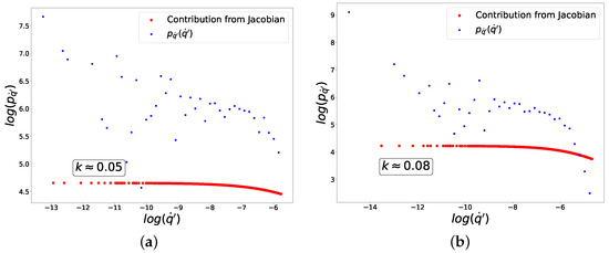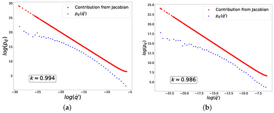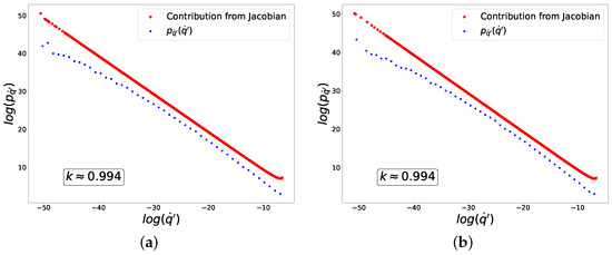 (blue dots) and the contribution from the Jacobian (red dots) to these distributions corresponding to Equation (