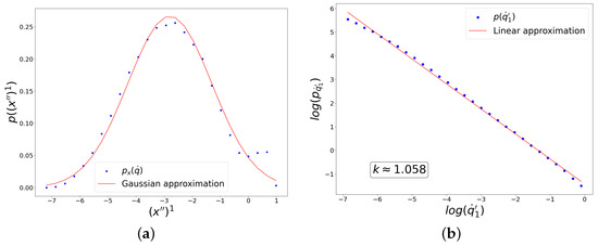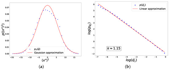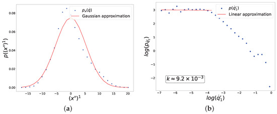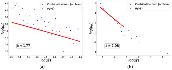 49). Please note that in this case, despite a nearly perfect power-law contribution from the Jacobian (red dots), the distribution of fluctuations as a whole (blue dots) is significantly distorted by the contribution from