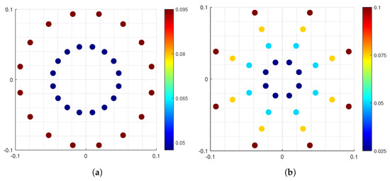 Figure 1. The diagram of 32–APSK constellation point distribution. (a) 2 4 × 2 1 of 32–APSK. (b) 2 3 × 2 2 of 32–APSK. The color bars represent the probability of each constellation point.