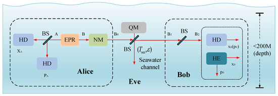 Figure 2. Seawater CVQKD based on N-APSK modulation model diagram. HD: homodyne detection; HE: heterodyne detection; EPR: Einstein–Podolsky–Rosen state; NM: N–APSK modulation; BS: beam splitter; T s e a , ε : channel parameter operator; QM: quantum memory.