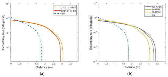 Figure 4. The functional relationship between transmission distance and key rate. (a) The functional diagram of different 32–APSK modulation schemes. (b) The functional diagram of different N–APSK modulation schemes.