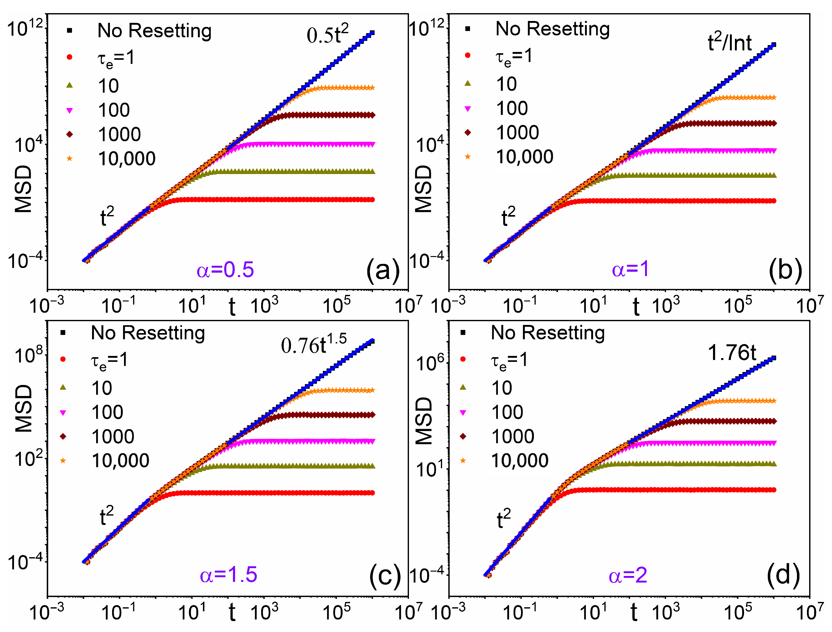 4] exhibit both Lévy-type long-distance migration and power-law resetting (e.g., periodic returns to nesting sites). The approach developed in this paper provides a quantitative framework for describing such phenomena by elucidating how the exponents of the jump length and resetting-time distributions jointly govern the mean-square displacement of a tagged diffuser—thus offering a more flexible tool to interpret diffusion data in biological and physical systems.