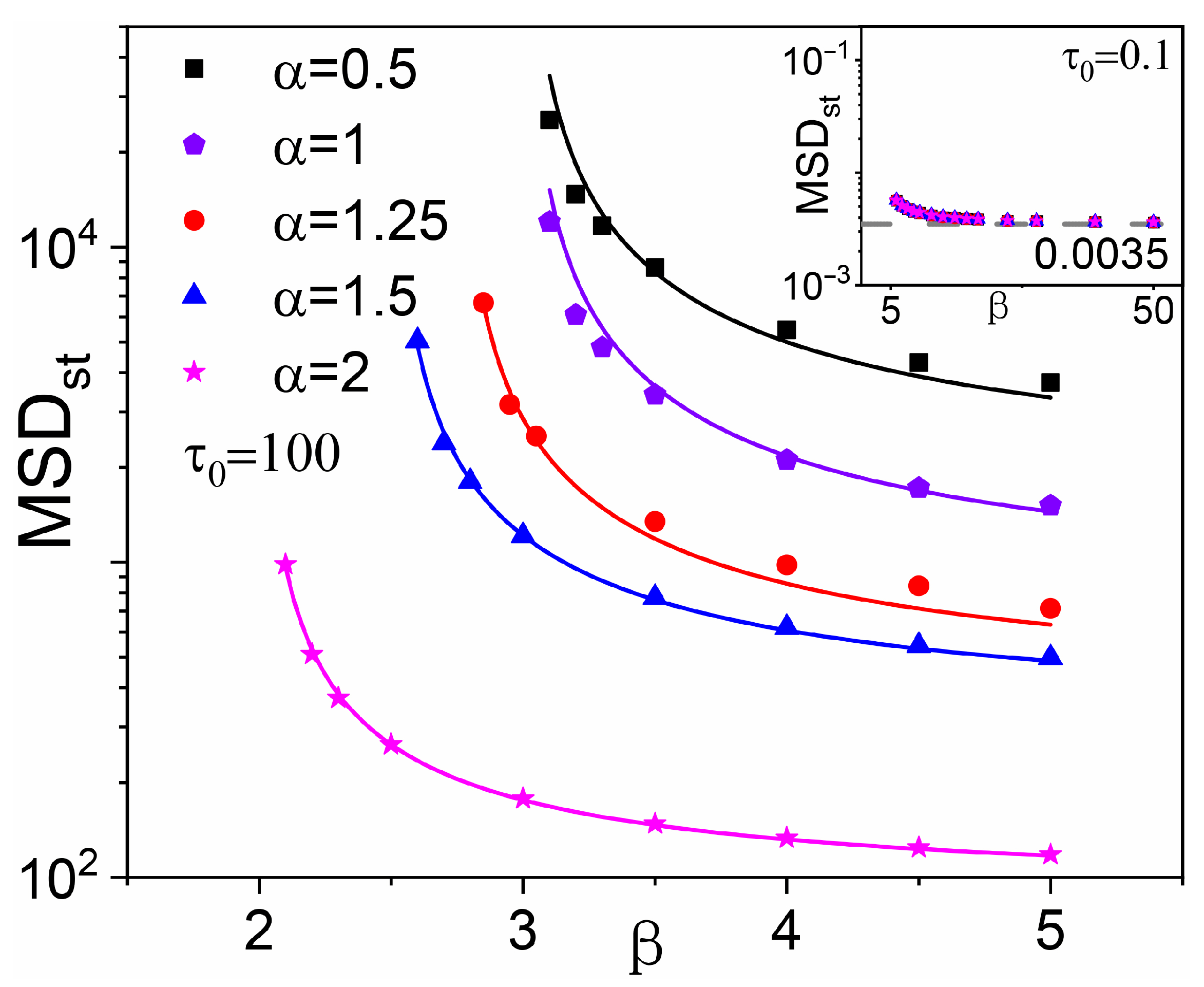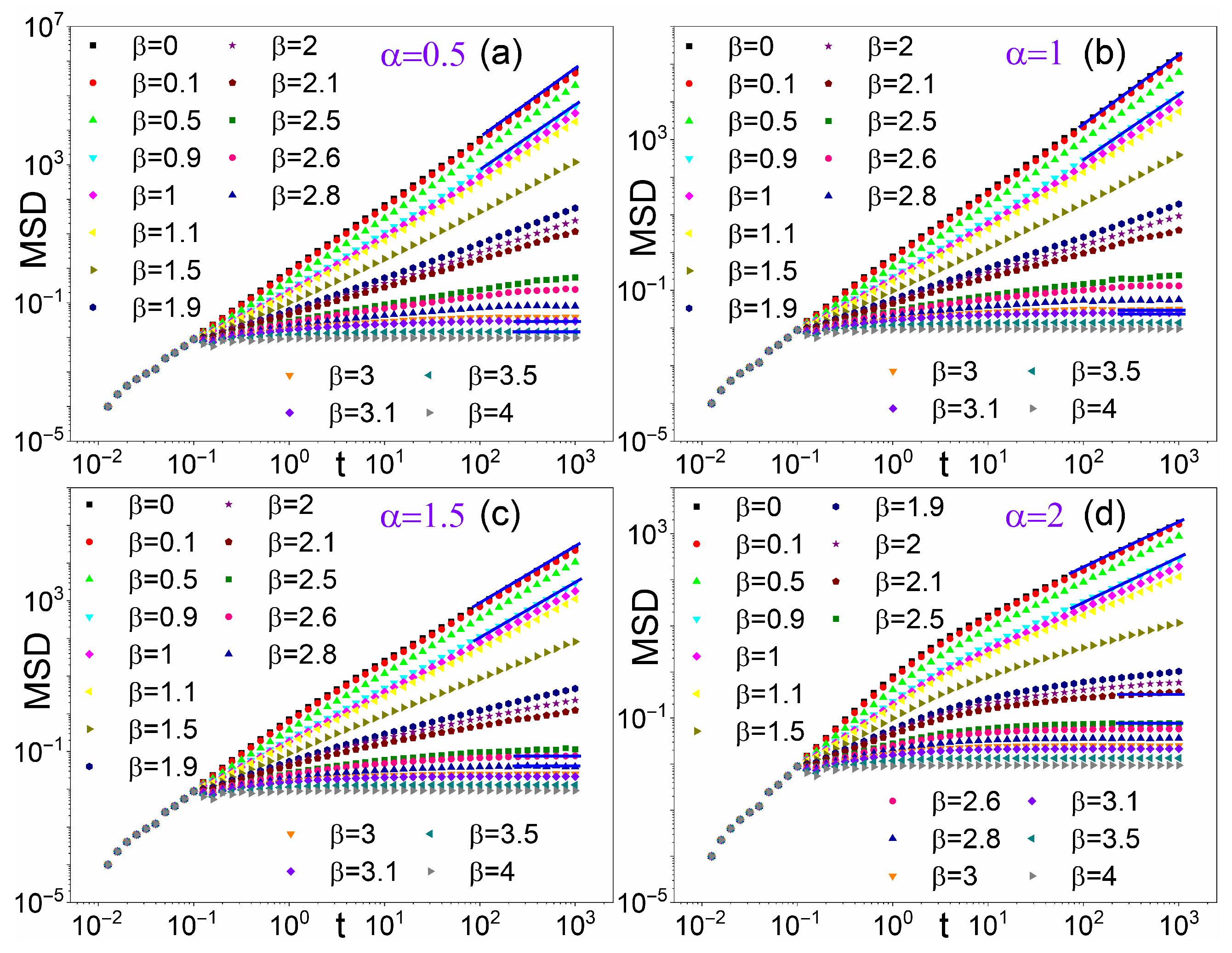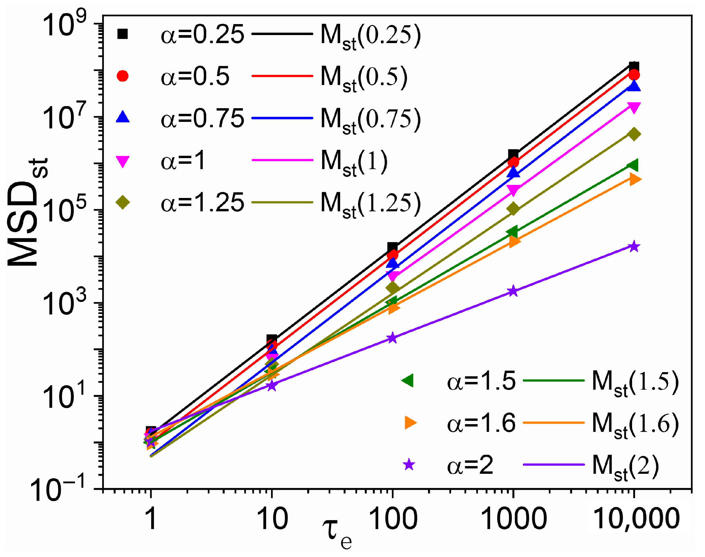 , confirming numerical reliability. In particular, simulated exponents consistently matched theoretical predictions across repeated trials, validating our numerical code for subsequent Lévy walk simulations under SR conditions. We confirm in passing that, as expected [
