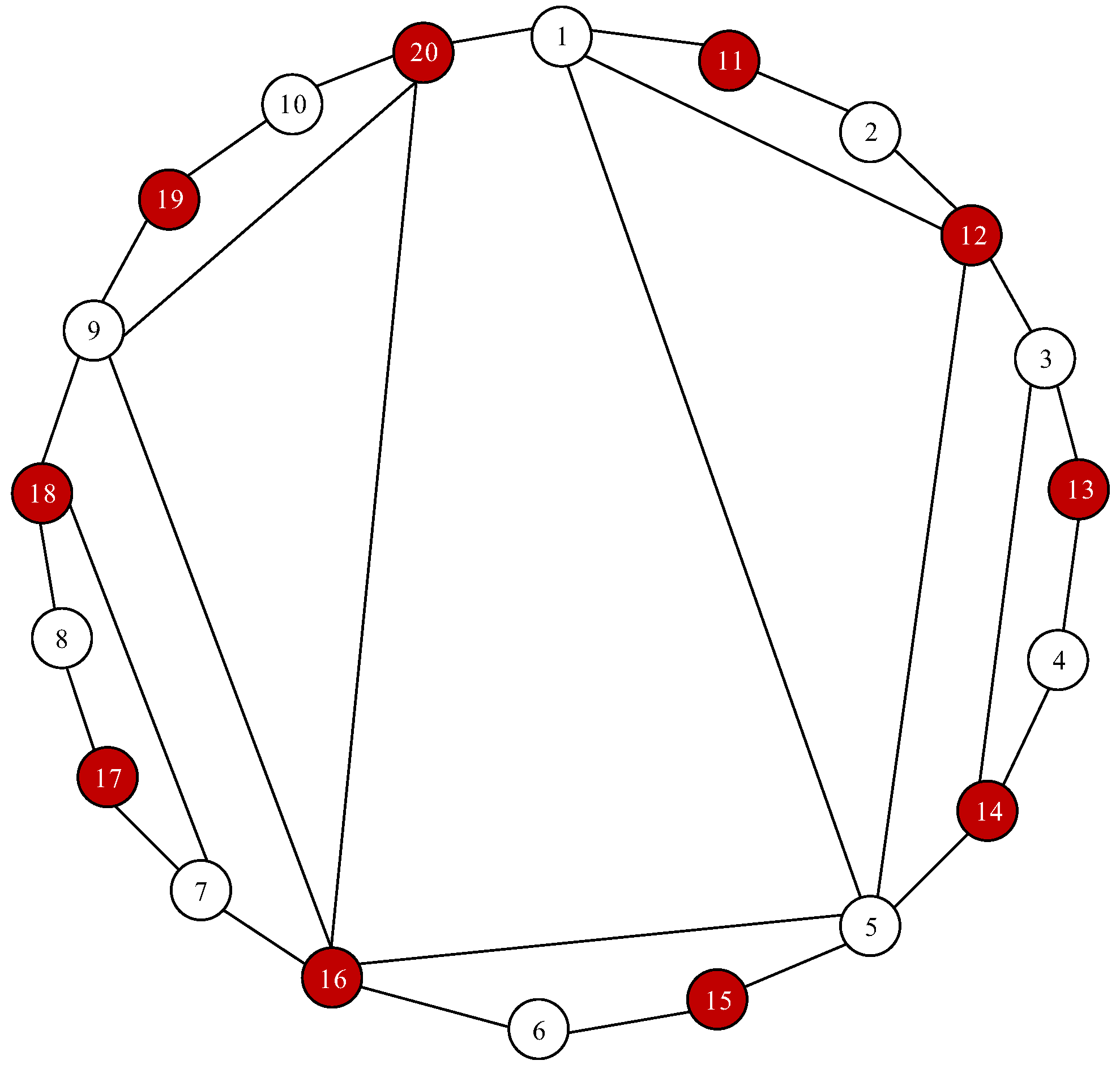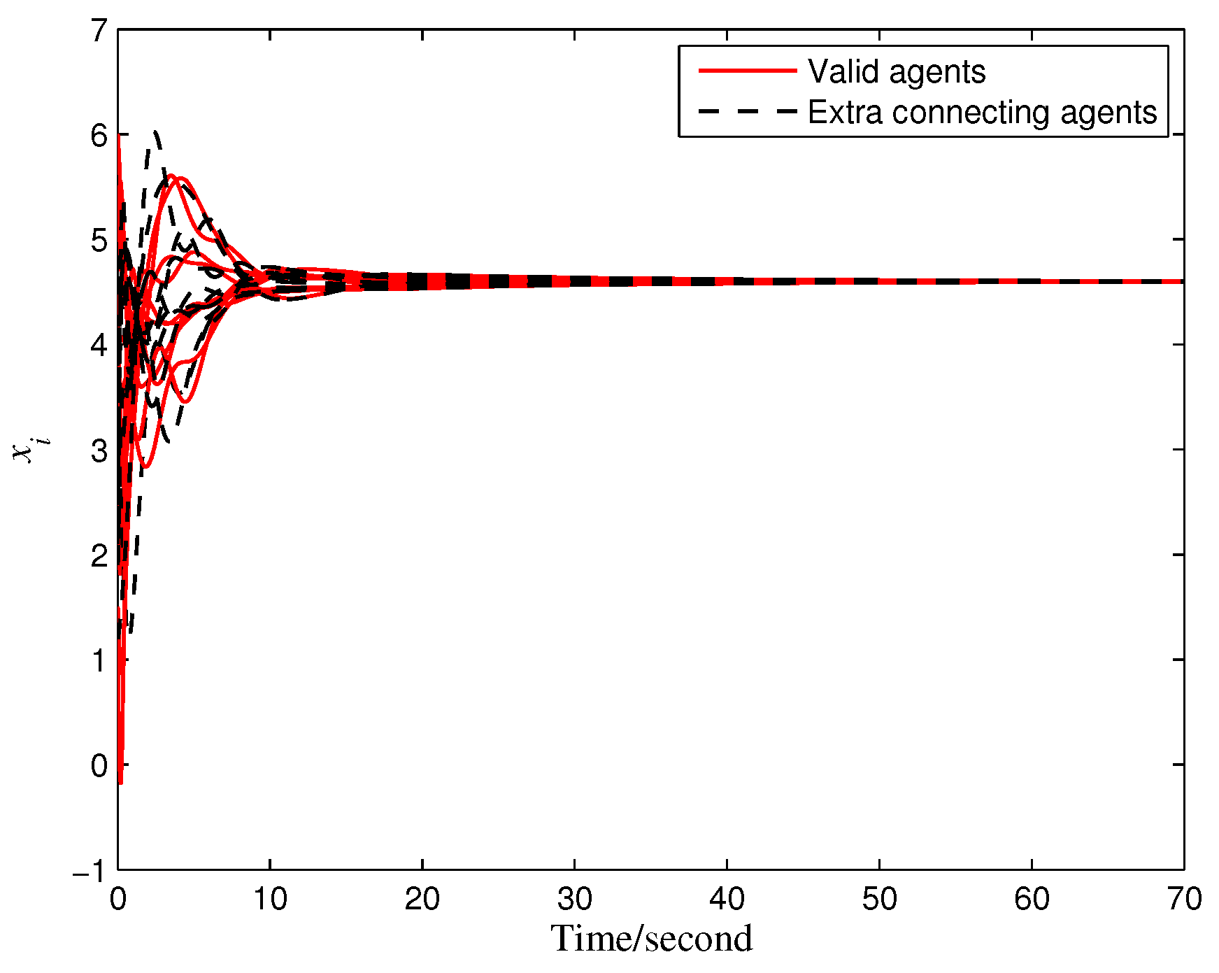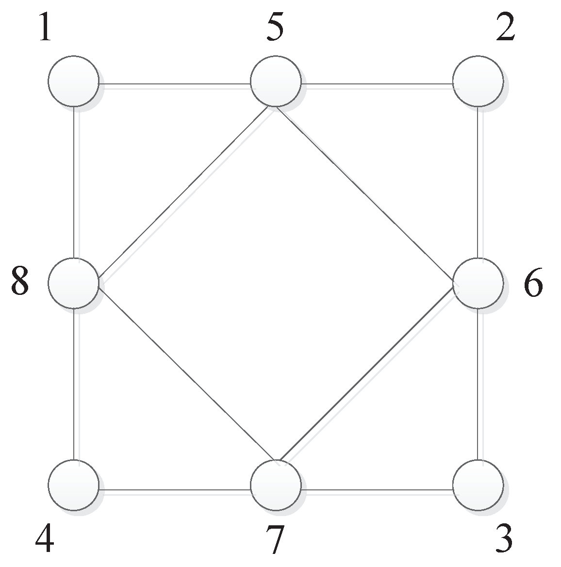 extra connecting agents . The information-exchanging topology adopted herein is shown in Figure 6. In Figure 6, the white circle and red circle denote the valid agents and extra connecting agents respectively, and the number denotes the index of the agent. Set the adjacent weights as 1