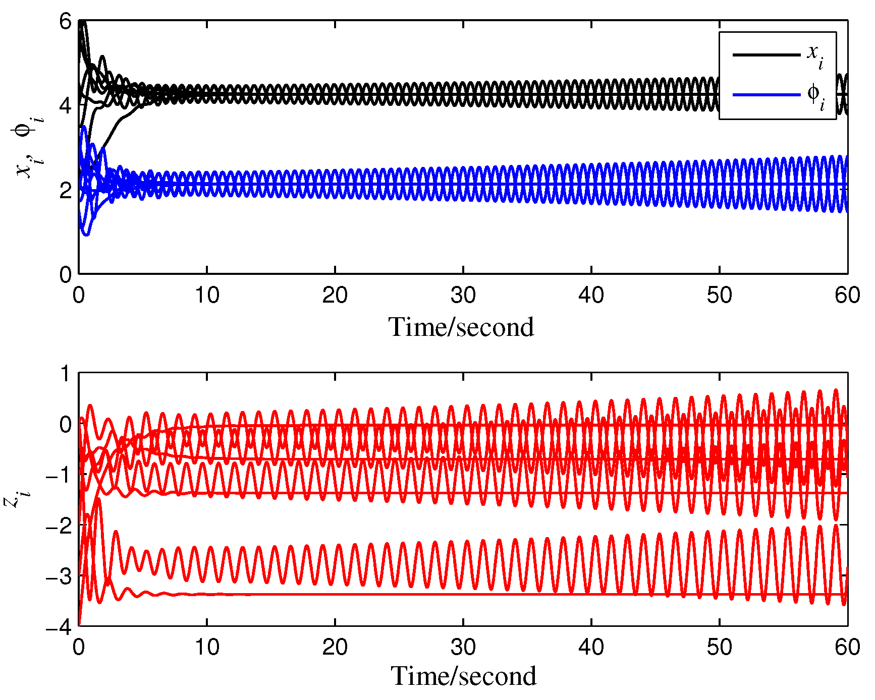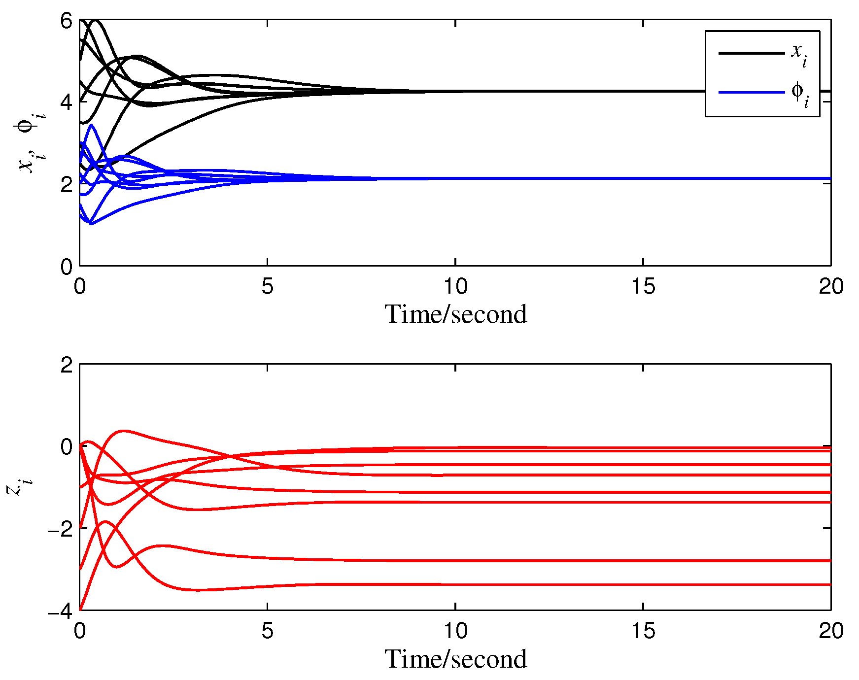 Figure 7) confirm that the system asymptotically converges to the average value of the mismatched reference signals. Additionally, the convergence behaviors of the distinct auxiliary and state signals illustrated in