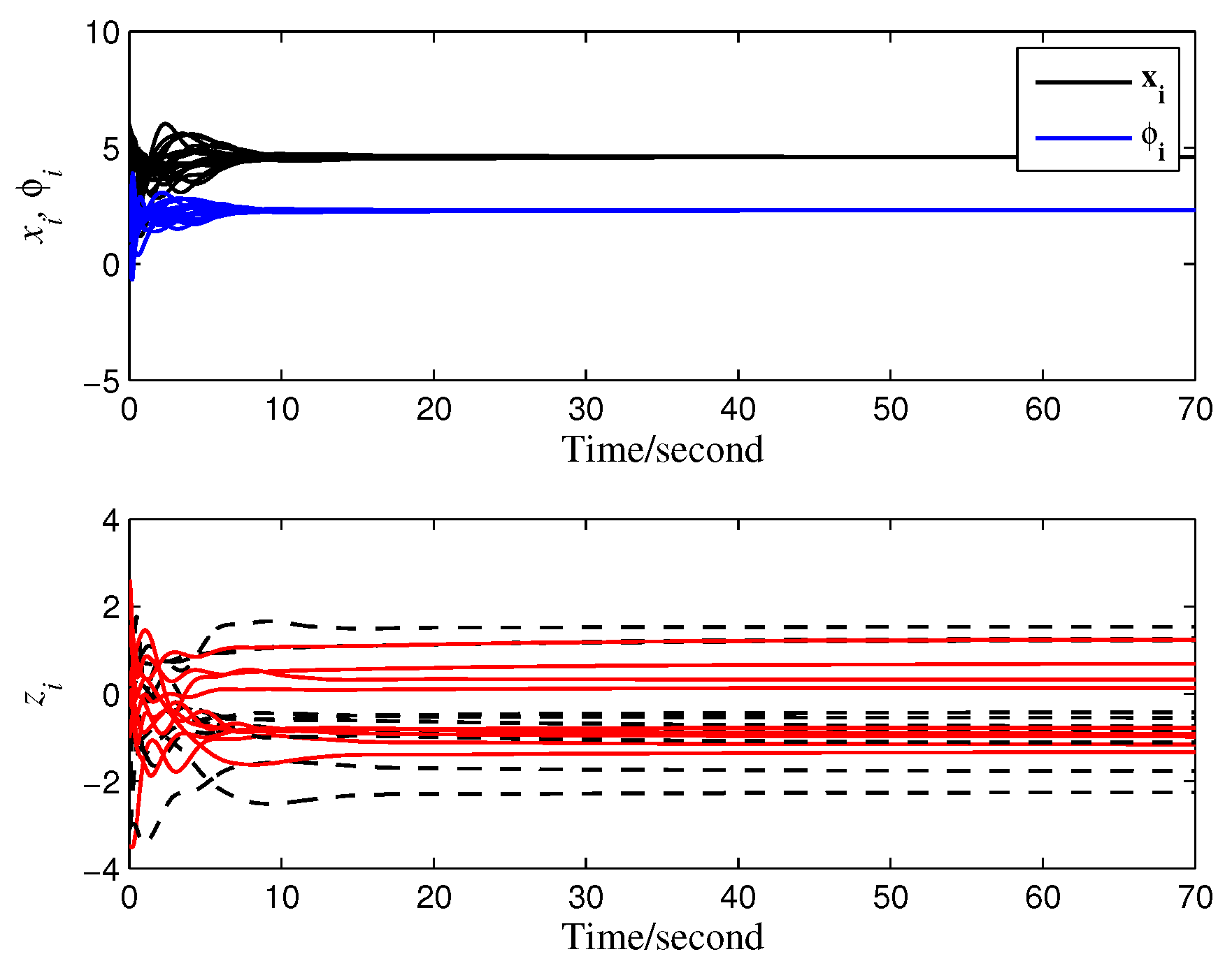 and obtain the largest eigenvalue of L of . The valid agents’ reference signals are , , so the average value of these signals is . Additionally, the control parameters are set as , and . Accordingly, the maximum allowable time delay
