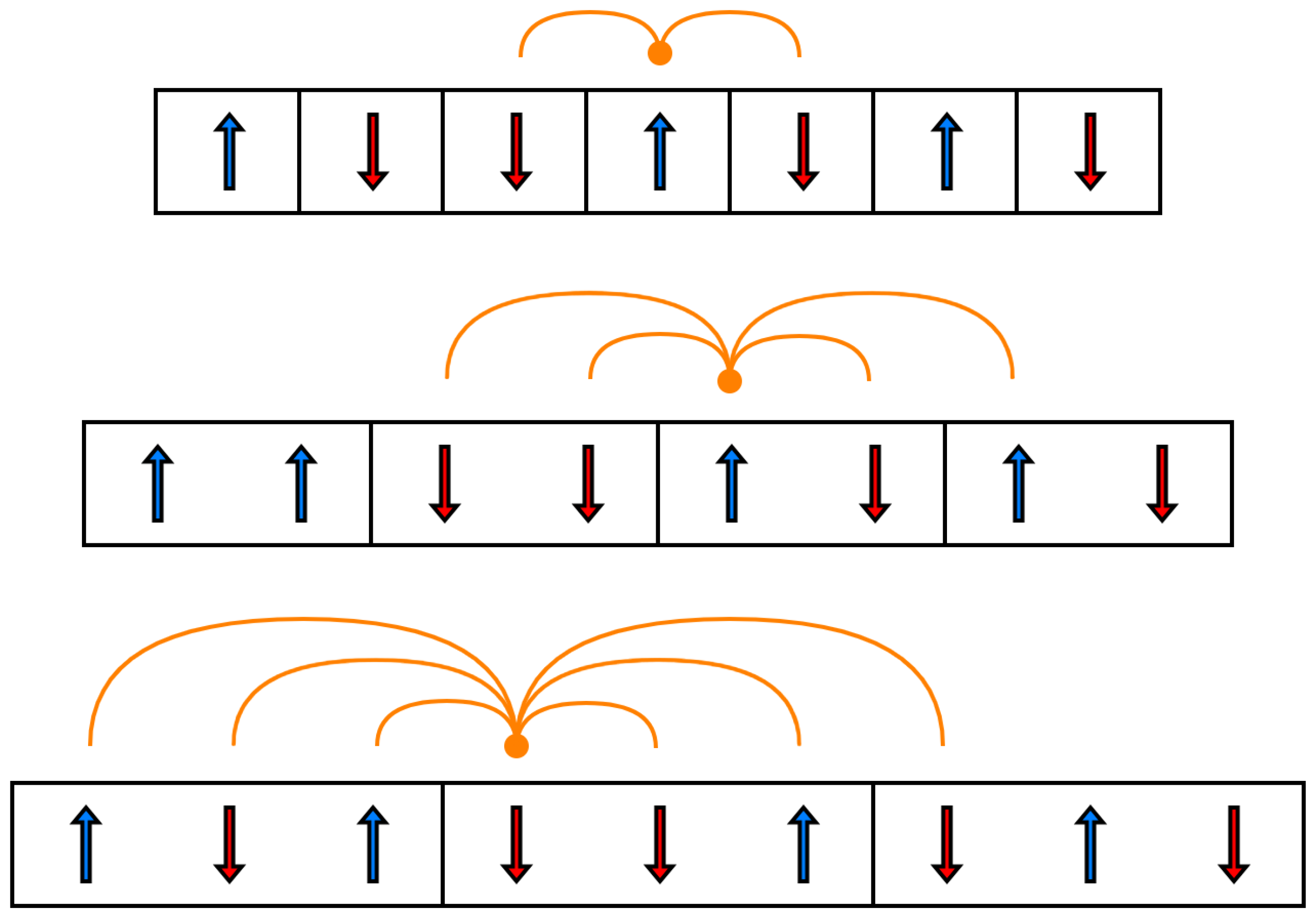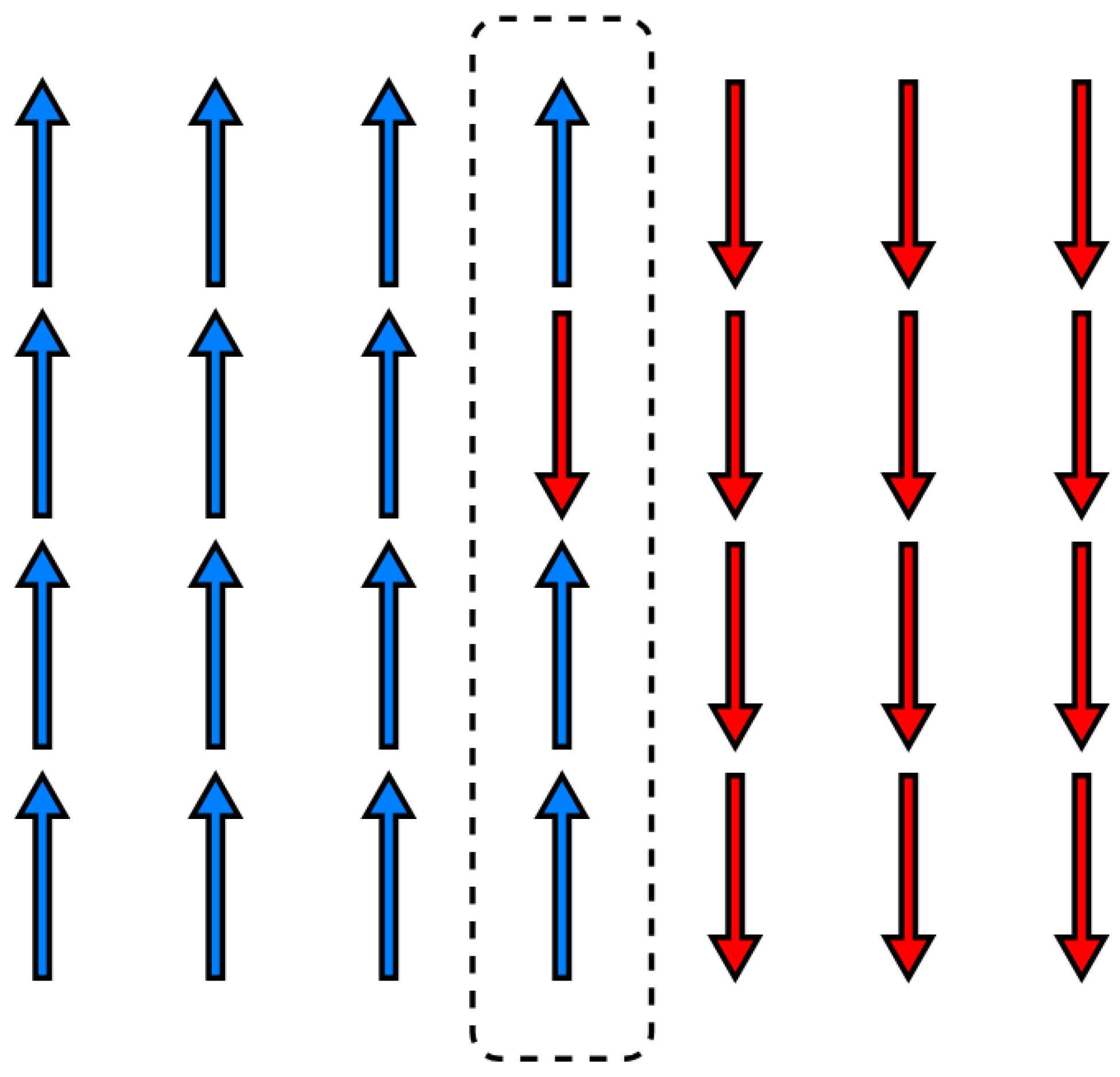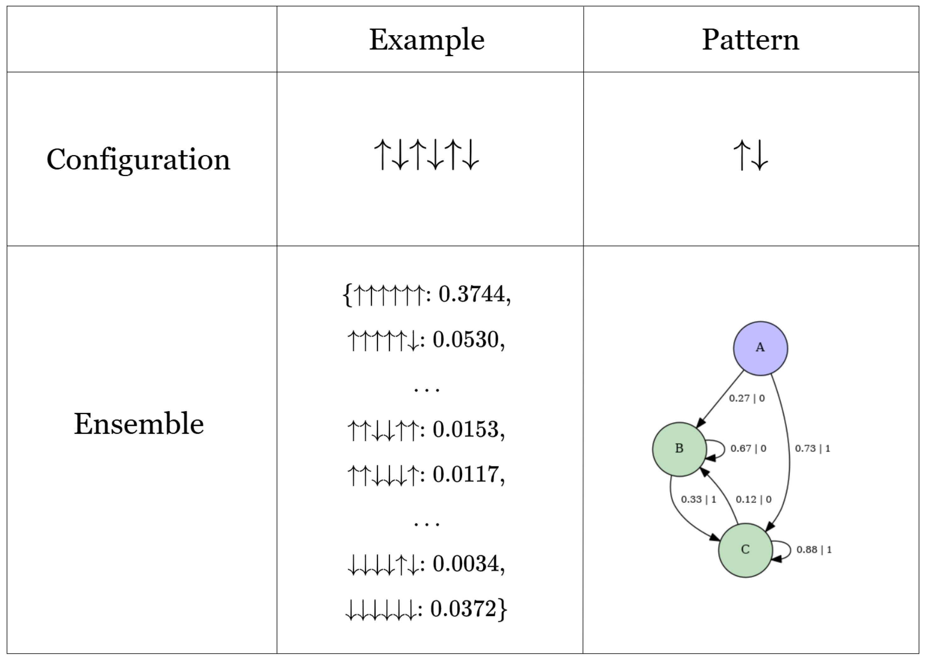- Periodicity Parameter (Type 2): Similarly, this parameter enhances periodicity but, as it varies, steers the system towards typical configurations with multiple distinct periods. In the nn Ising model, this role is played by the coupling constant J. A high positive J value tends to produce period 1 configurations (all spins up), akin to B, but a negative J value leads to alternating spin configurations (e.g., up-down-up-down), indicating that the typical configuration can be of period 2.