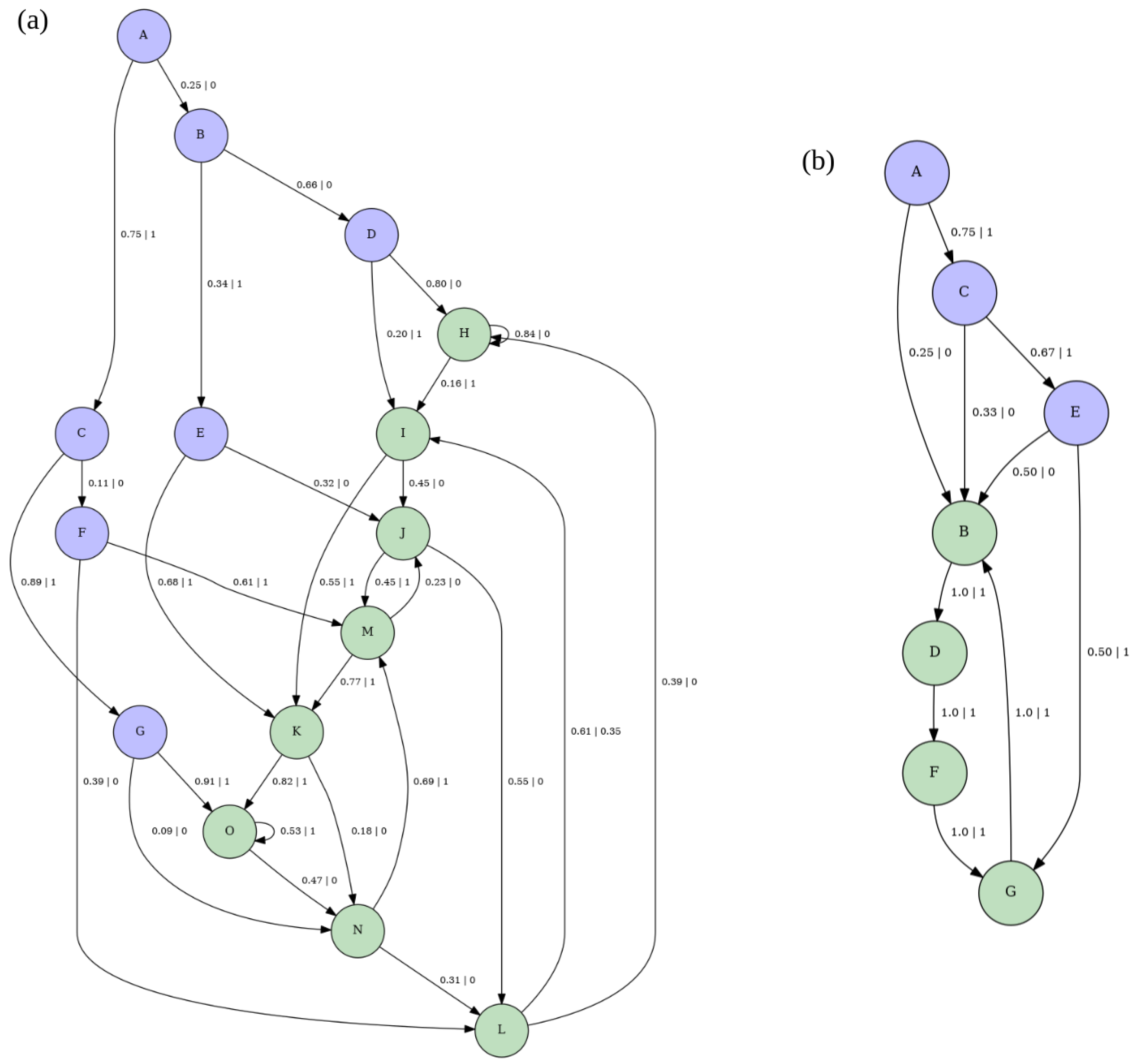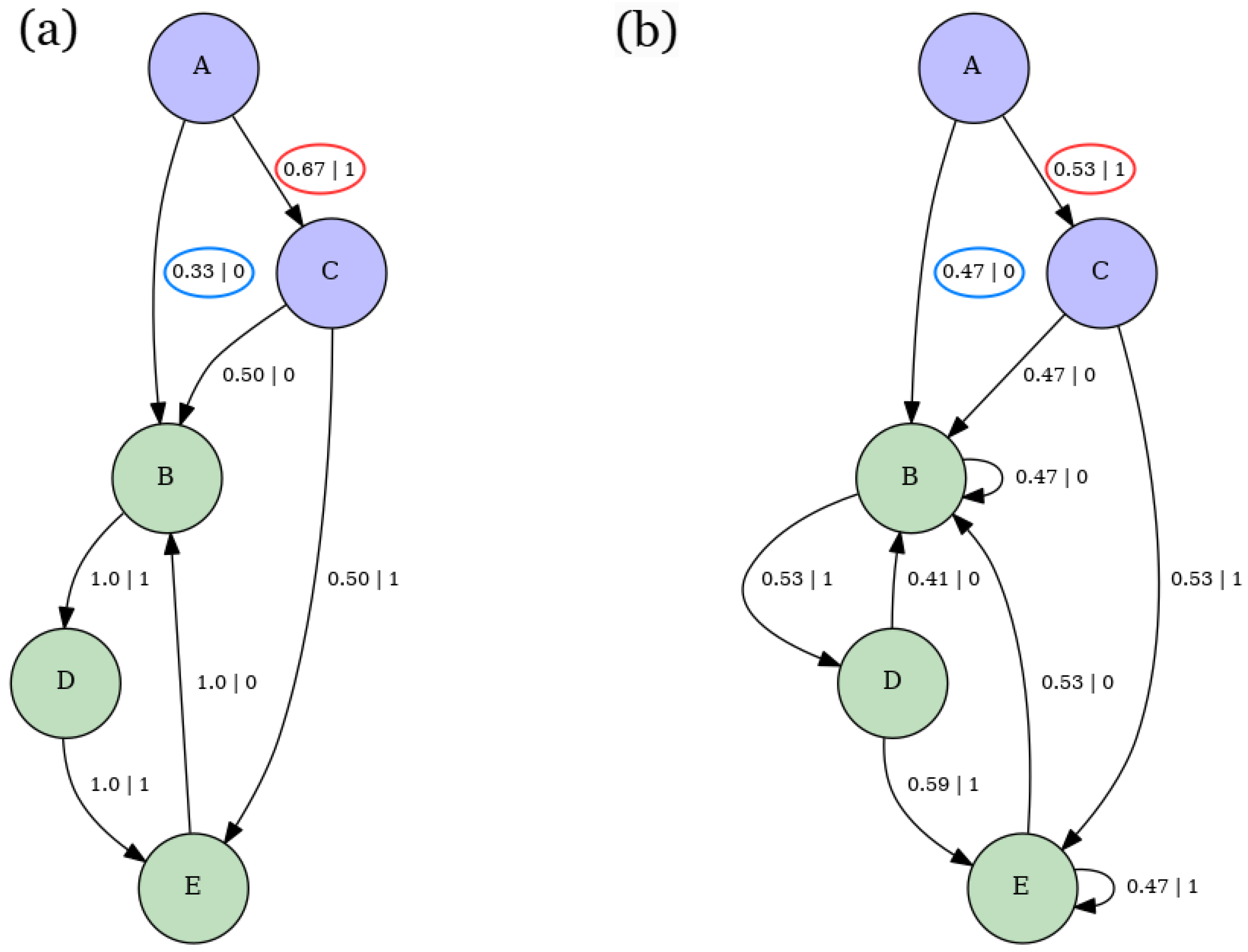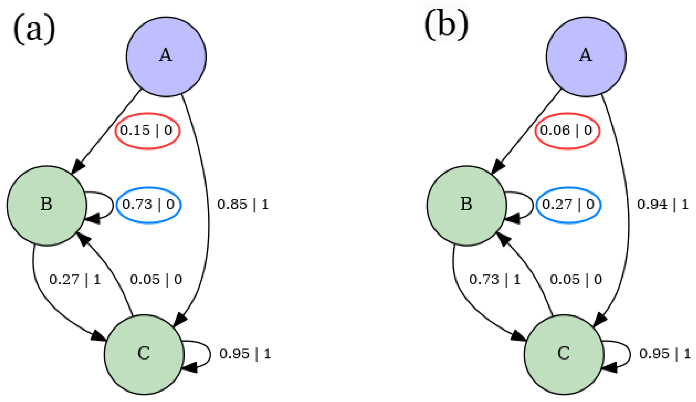 - Calculate asymptotic causal state probabilities using two facts:Since , by inspection, we have the following: