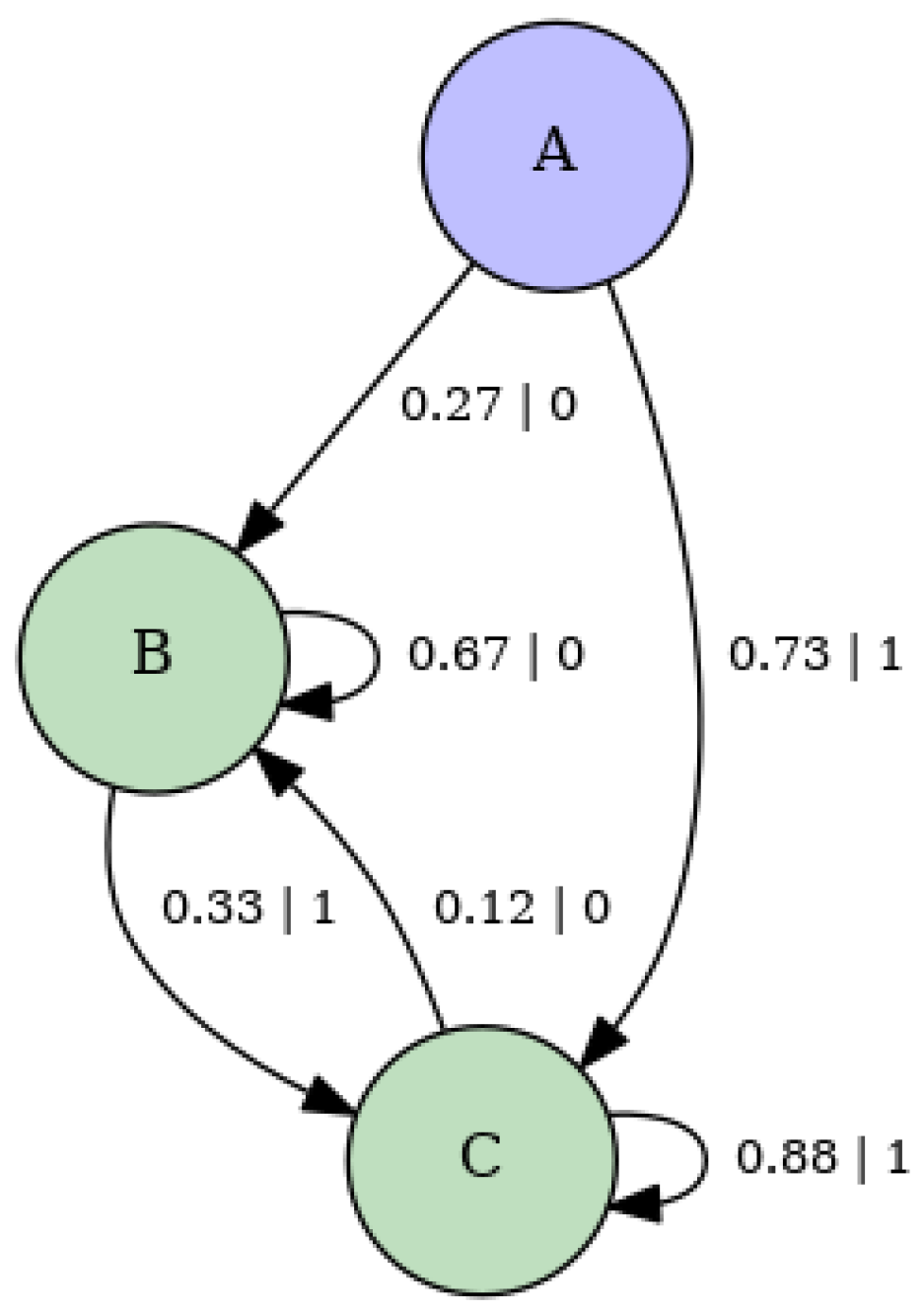 - Build HMM representation of -machine using the transition matrix . Details of the resulting machine, for the parameter values , , and , are provided in Appendix E.