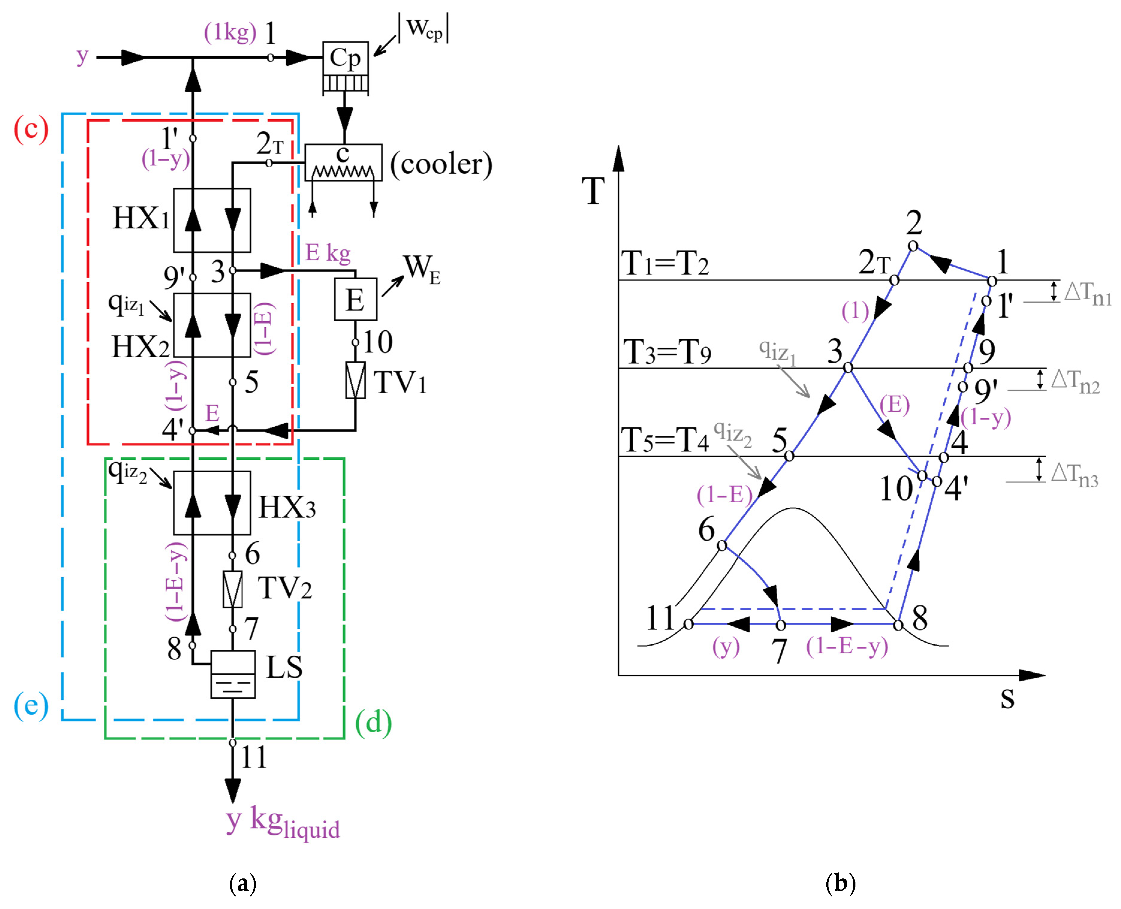 7], through which both the quantitative and qualitative aspects of the internal thermodynamic processes were evaluated. This analysis enabled the identification of the main sources of irreversibility, quantification of exergy destruction, and formulation of structural optimization solutions. Continuing this approach, the present study focuses on the Claude–Heylandt cycle. The evolution toward the Claude cycle introduced a significant improvement compared to the Linde–Hampson cycle by integrating an expander in parallel with the throttle valve. This configuration optimizes the distribution of gas flow rates, reduces exergy destruction, and enhances the overall performance of the system. Simultaneously, the approach includes fractioning of the forward flow rate, a technique that redirects a part of the gas flow toward the expander, thereby allowing an additional cooling contribution in the returning stream. Several studies [