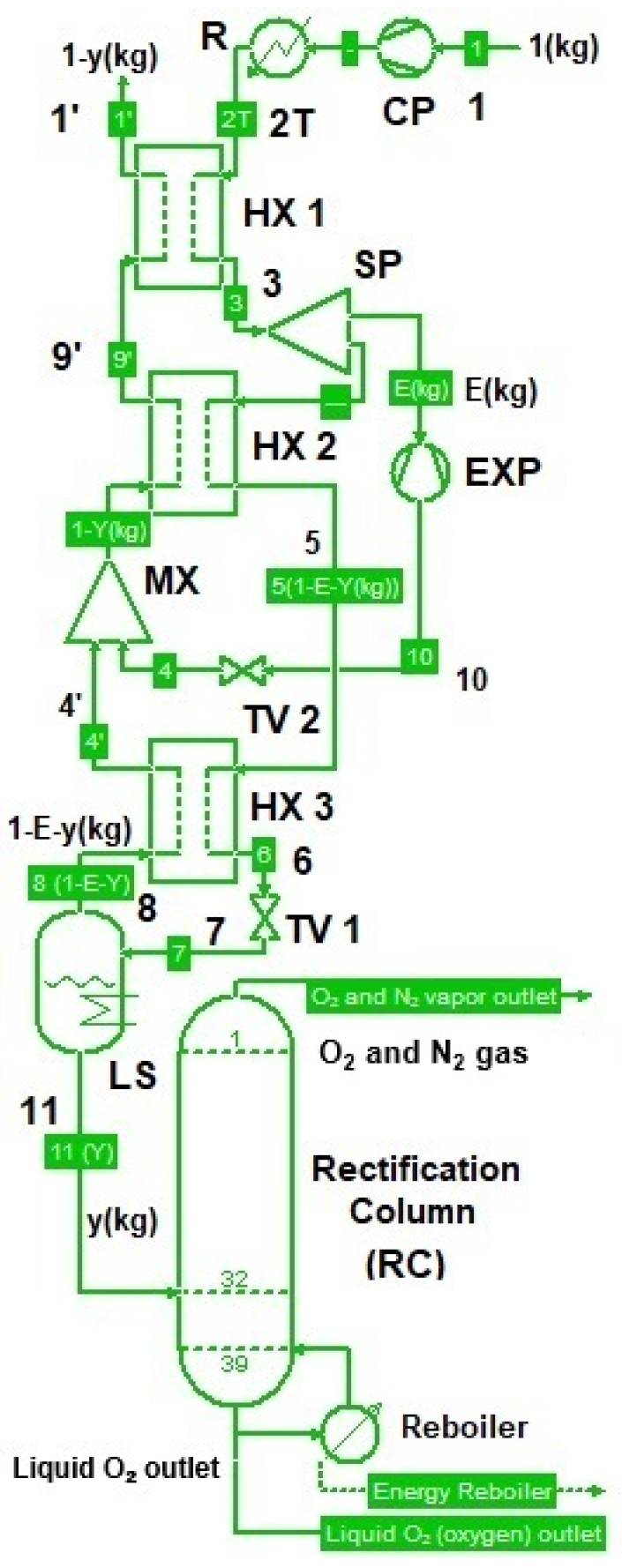 The liquefied air (y = 0.185 kg/kg of compressed air), obtained using the Claude–Heylandt cycle, was introduced into the rectification column. In this column, the separation of the main components, nitrogen and oxygen, occurred because of the differences in their vaporization temperatures.