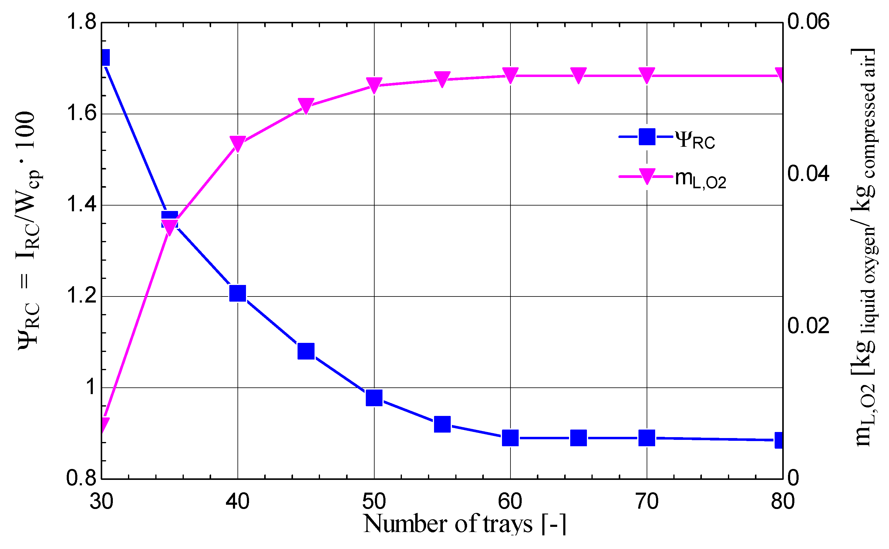 Through the analysis of the influence of the number of trays, it was found that, as this number increased, the exergy destruction relative to the mechanical-work consumption decreased, while the flow rate of liquid oxygen with 99% purity increased (