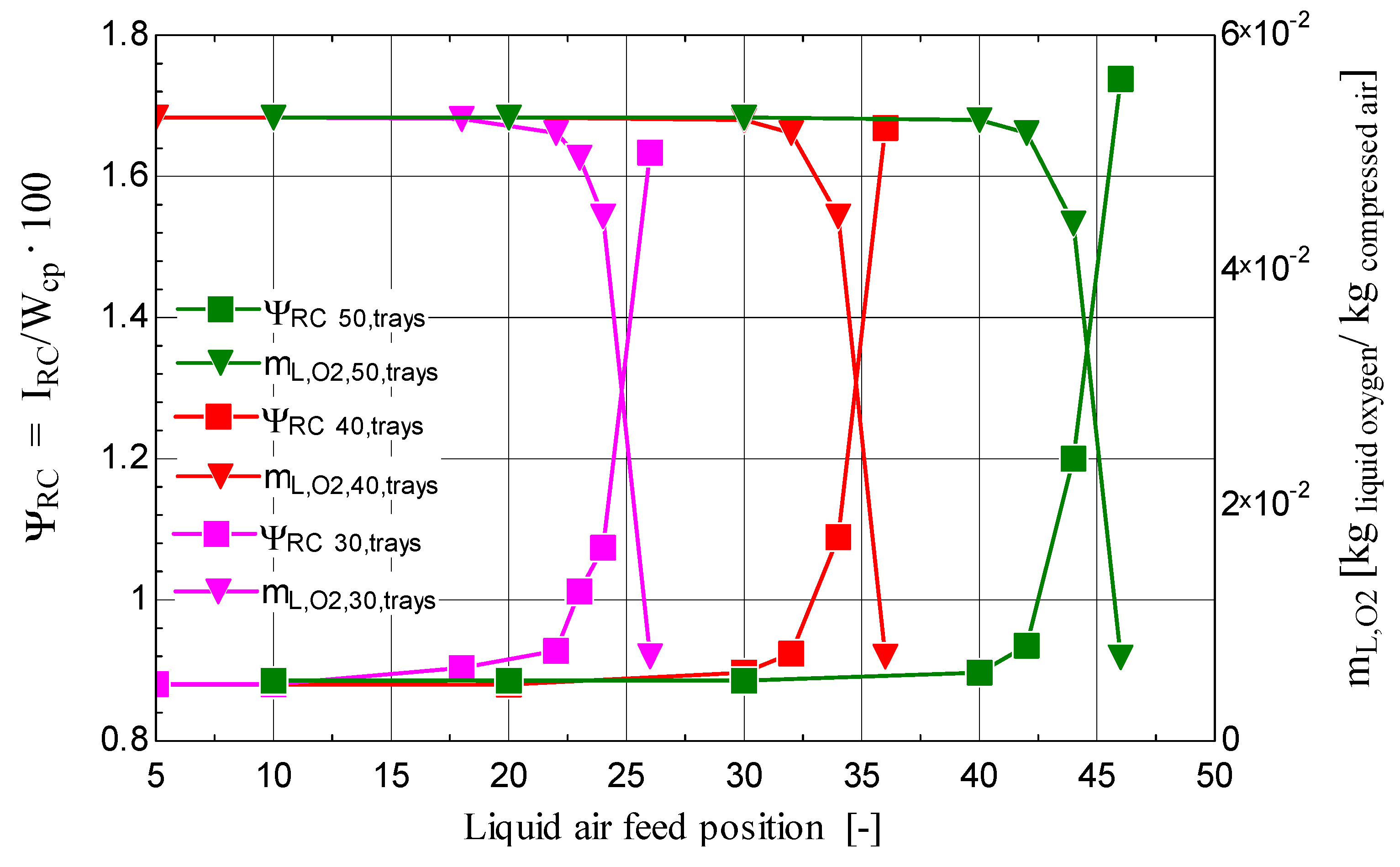 The analyzed case concerns the integration of a rectification column into the Claude–Heylandt cryogenic cycle, which operates with the parameters , , , , . The column was fed with liquid air at a flow rate of y = 0.185 [kg/kg of compressed air]. The objective was to optimize the operation of the rectification column by selecting the number of trays and vertical position of the liquid-air feed point in the column, with the aim of obtaining liquid oxygen with purity above 99%.