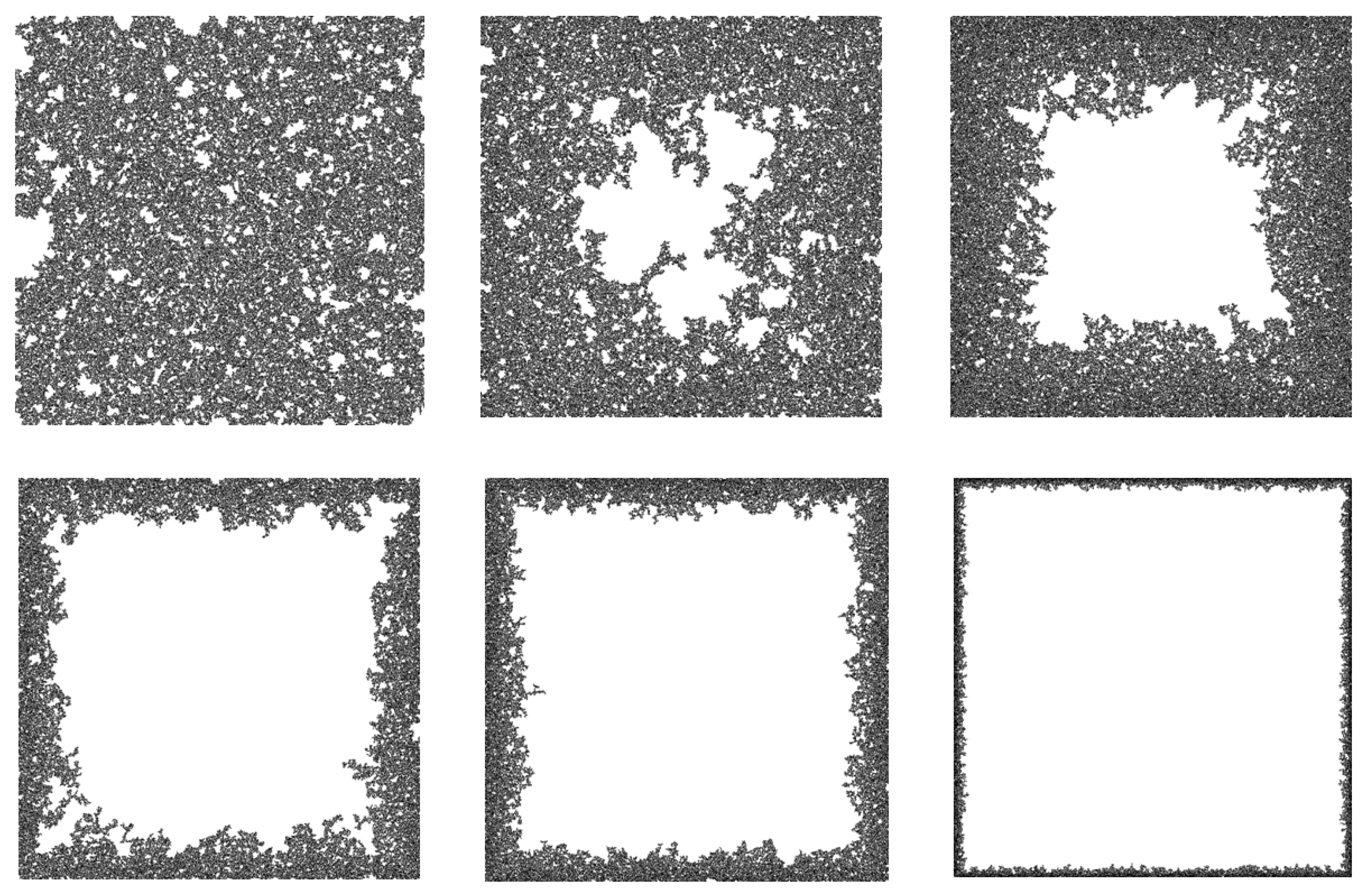 Figure 2 that the lattice starts to become empty in the middle, while the area close to the perimeter is still relatively more occupied, as is expected in this model. The corresponding spanning clusters for the same