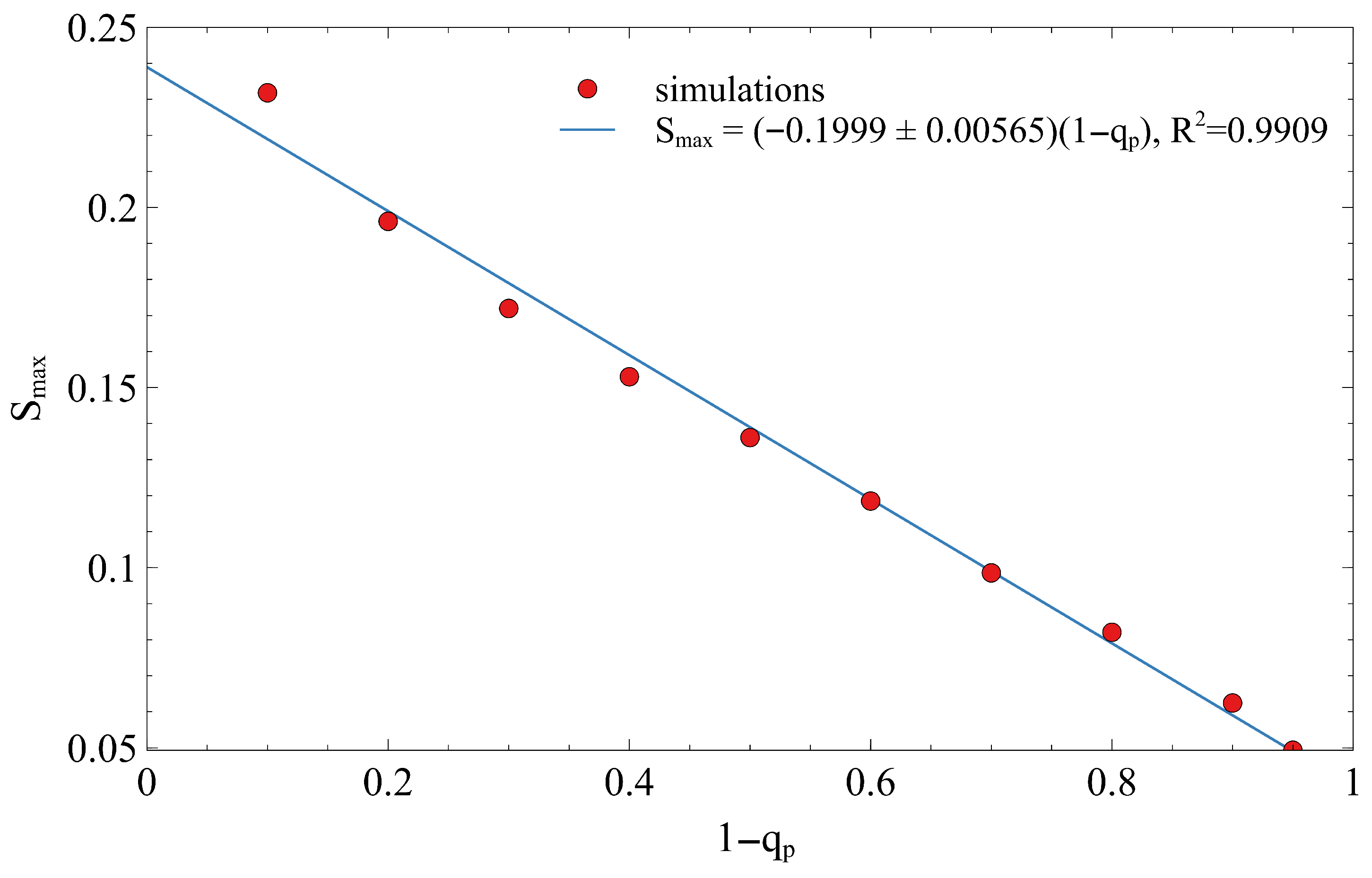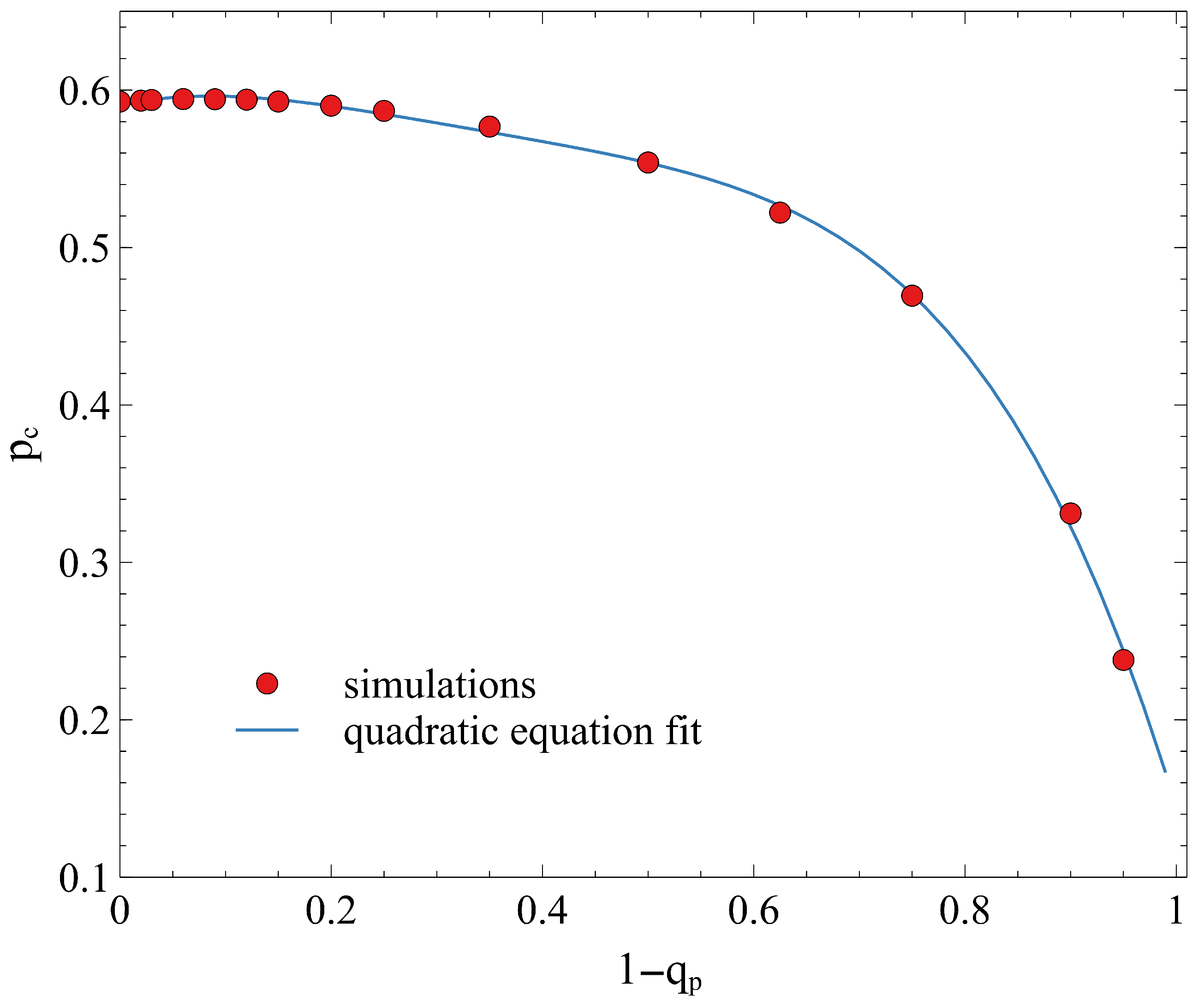 becomes uniform throughout the entire lattice. Under this condition, the spatial gradient vanishes, and every site is removed with certainty, leading to a completely vacant lattice. This represents the absolute upper bound of the infection process, where the system cannot sustain any connectivity. While we tried several fittings for the points of