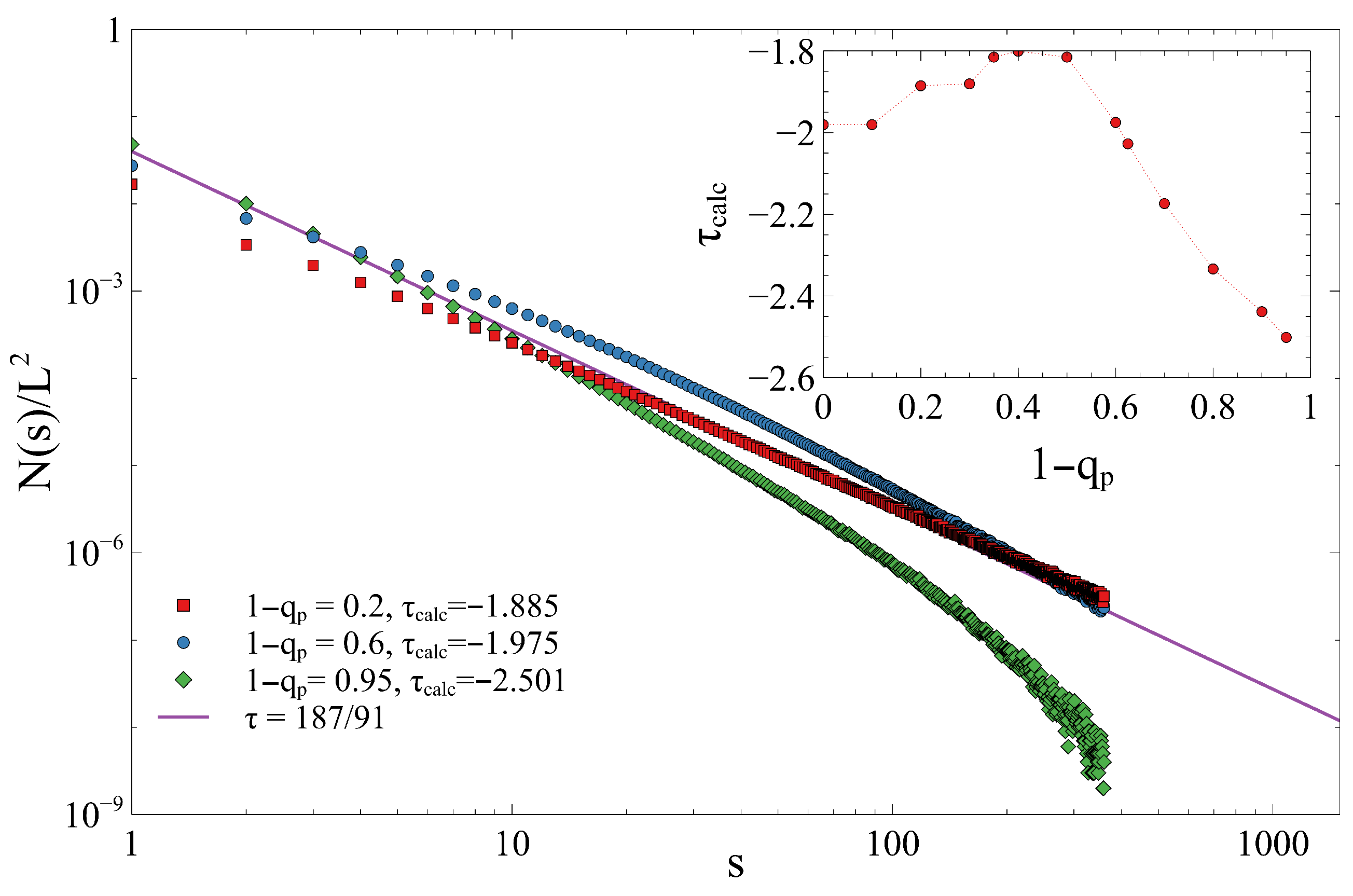 Figure 7 (in a log–log plot) confirms that the cluster size distribution follows a power law for all tested values of