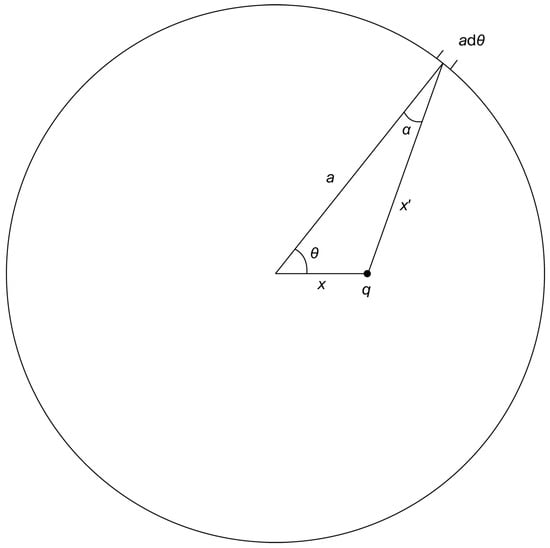 A diagram for computing (1) the potential energy and (2) the “work done” in changing a, the radius of the ring. is the angle from the horizontal axis and center of the ring to the segment . is the distance from q to . is the angle between a and ; it will be used in the next subsection for computing the work done in changing a.