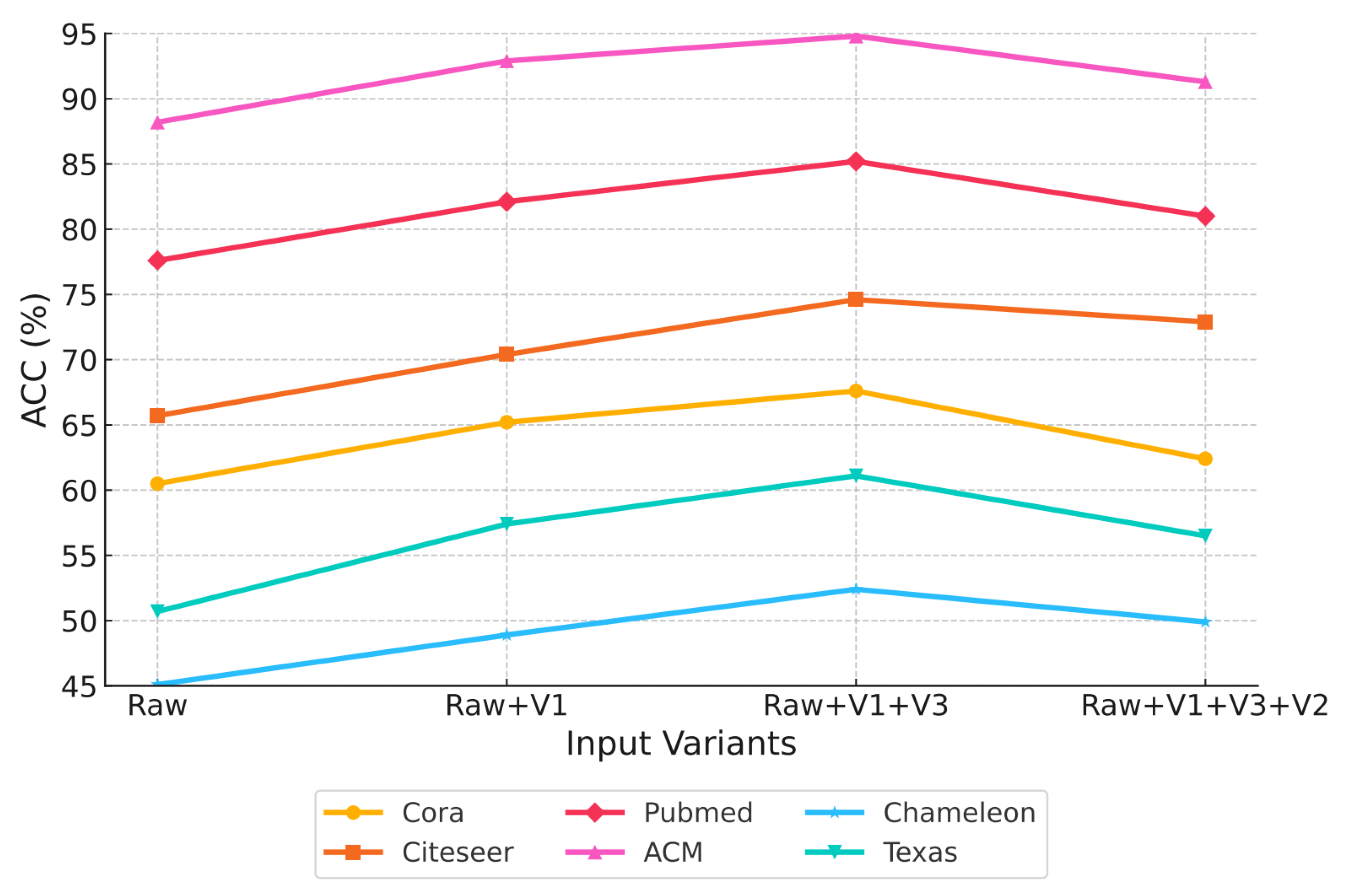 Table 8 indicate that the performance of augmented views varies notably across datasets, reflecting the distinct structural and semantic characteristics captured by each view. The PC view attains the highest accuracy on the Cora and ACM datasets, suggesting that cosine similarity preserves meaningful feature correlations beneficial for classification, while the PK view performs slightly better on Pubmed, implying that neighborhood-based relations are more informative in this dataset. Such inconsistency among single views highlights the necessity of filtering and integrating multiple complementary views. When multiple views are combined, classification accuracy improves substantially compared with individual views. Among them, Raw+PC+PK consistently achieves the best results across all datasets, indicating that combining feature-similarity and structural-proximity views enhances the representational capacity of the model and leads to more effective multi-view learning.