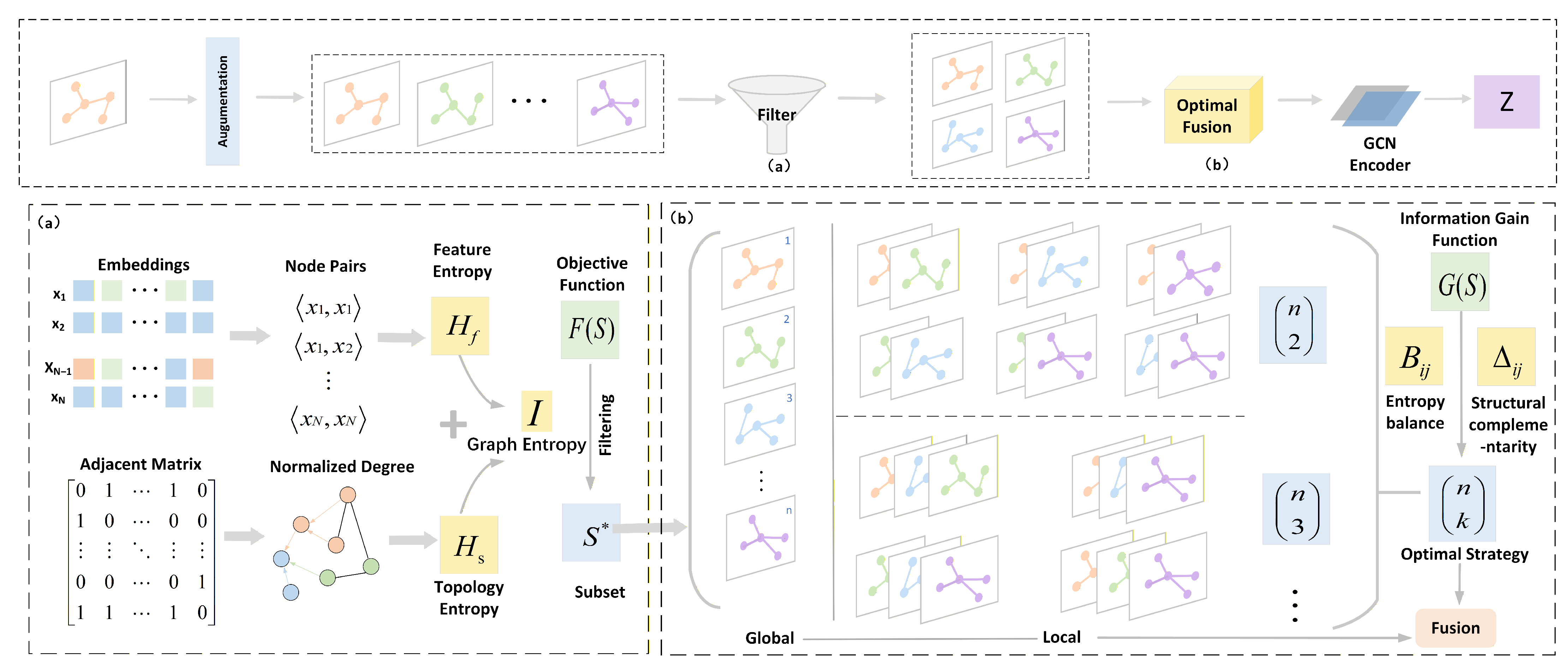 In addition, to promote more effective fusion of informative views, we propose an optimized fusion mechanism that is introduced after filtering to adaptively determine the optimal integration strategy which yields the most informative representations. A novel information gain function is proposed to evaluate candidate view groupings based on entropy balance and structural complementarity. Entropy balance is achieved by normalizing the entropy of each view matrix and computing an equilibrium degree, which encourages uniform information contribution and avoids interference in fusion. Structural complementarity is enforced by normalizing structural differences and defining an information gain term that favors the grouping of view matrices exhibiting significant topological diversity. By selecting the subset that maximizes overall group gain as the optimal integration strategy, this module achieves balanced and complementary fusion, thereby facilitating effective collaboration among views.