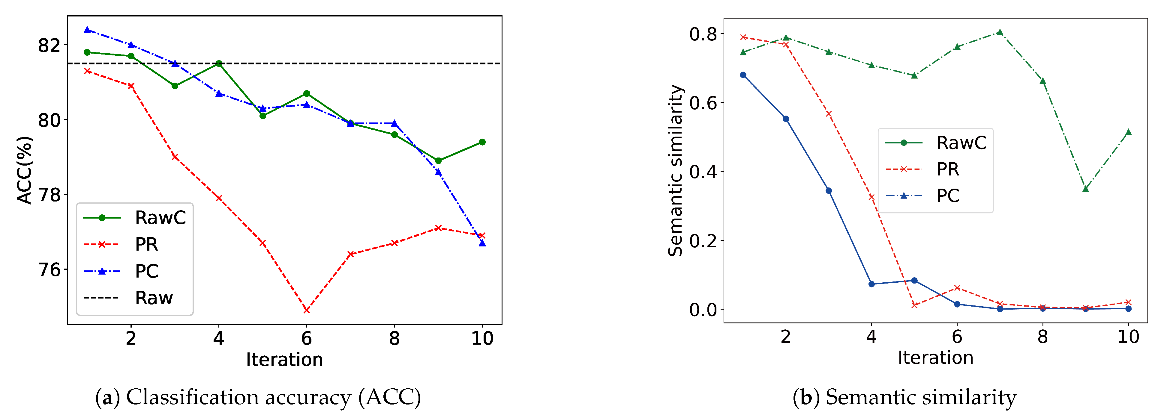 Table 7 summarizes the descriptions of the various views. To visualize the representational capacity of each view (PR, PC, RawC, and Raw), a broken-line chart was employed, tracking changes after each iteration. The alignment between each augmented view and the original input view (Raw) was subsequently quantified by examining their semantic similarity. Both the augmented and original views were encoded using a shared GCN encoder with identical parameter settings, and their learned graph representations were subsequently compared to assess semantic alignment.