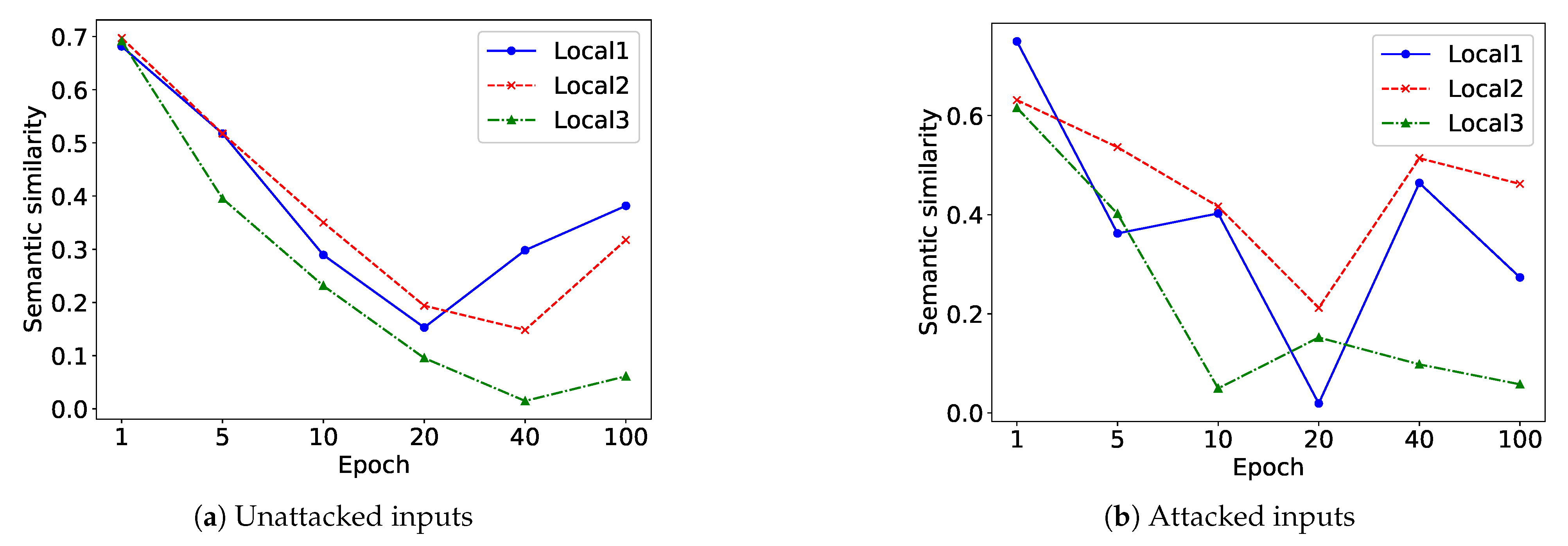 On the Cora benchmark, we monitored the evolution of semantic similarity across embeddings from the global and local views throughout the learning process. This is presented through a line-based visualization computed at selected training epochs {1; 5; 10; 20; 40; 100}. The embedding vectors for all views were obtained through the same GCN encoder. Their semantic similarity was subsequently quantified by analyzing the resulting feature representations, as depicted in