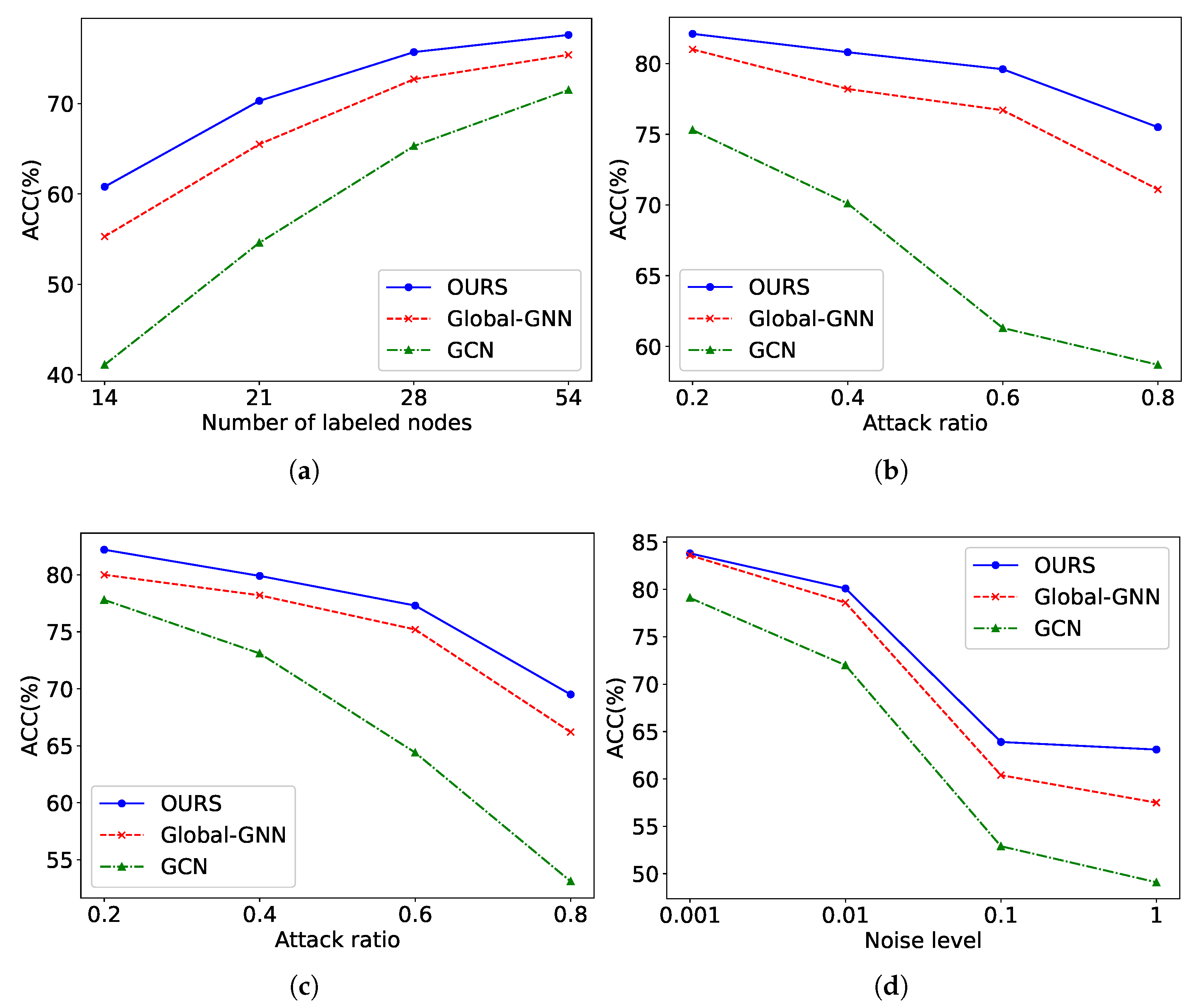37] to a set of four uncertainty scenarios. These conditions were used to examine how reliably each model maintains classification performance when exposed to varying views. These uncertainties may introduce disturbances to the graph structure or node semantics, thereby affecting classification accuracy. All experiments were conducted on the Cora dataset. The number of labeled nodes was set to {14; 21; 28; 54}. The attack and mask ratios were {0.2; 0.4; 0.6; 0.8}, and the noise level was adjusted to {0.001; 0.01; 0.1; 1}. For topology and feature masking, we randomly removed a portion of edges or node features according to the specified ratio. The modified graphs were then used to test classification performance on the corrupted data. In the case of feature corruption caused by node noise, we perturbed the input attributes by injecting Gaussian disturbances, where the parameter noise level controls the strength of the added variation. This process intentionally distorts the original feature distribution to evaluate model stability with corrupted inputs. The corresponding outcomes are presented in