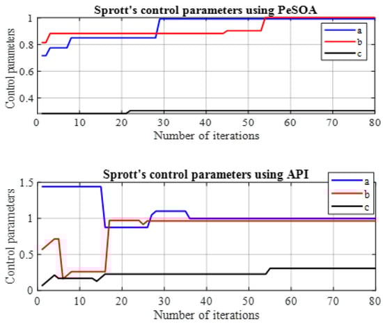 We emphasize that the controller is not updated during the RK4 numerical integration. Instead, both the control gains and the intrinsic Sprott parameters are jointly optimized at each iteration of the API or PeSOA metaheuristic algorithm. During each iteration, a candidate parameter vector is evaluated by integrating the master–slave Sprott systems with RK4 and computing the long-term synchronization error.