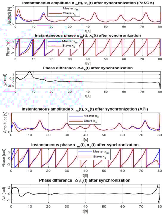 In both Algorithms, the errors converge toward zero, as shown in Figure 14, indicating that the synchronization process was successful and that the transmitted and received signals are nearly identical. Notably, the smoother and faster decay observed with PeSOA highlights its superior performance over API in minimizing synchronization errors and ensuring accurate signal transmission.