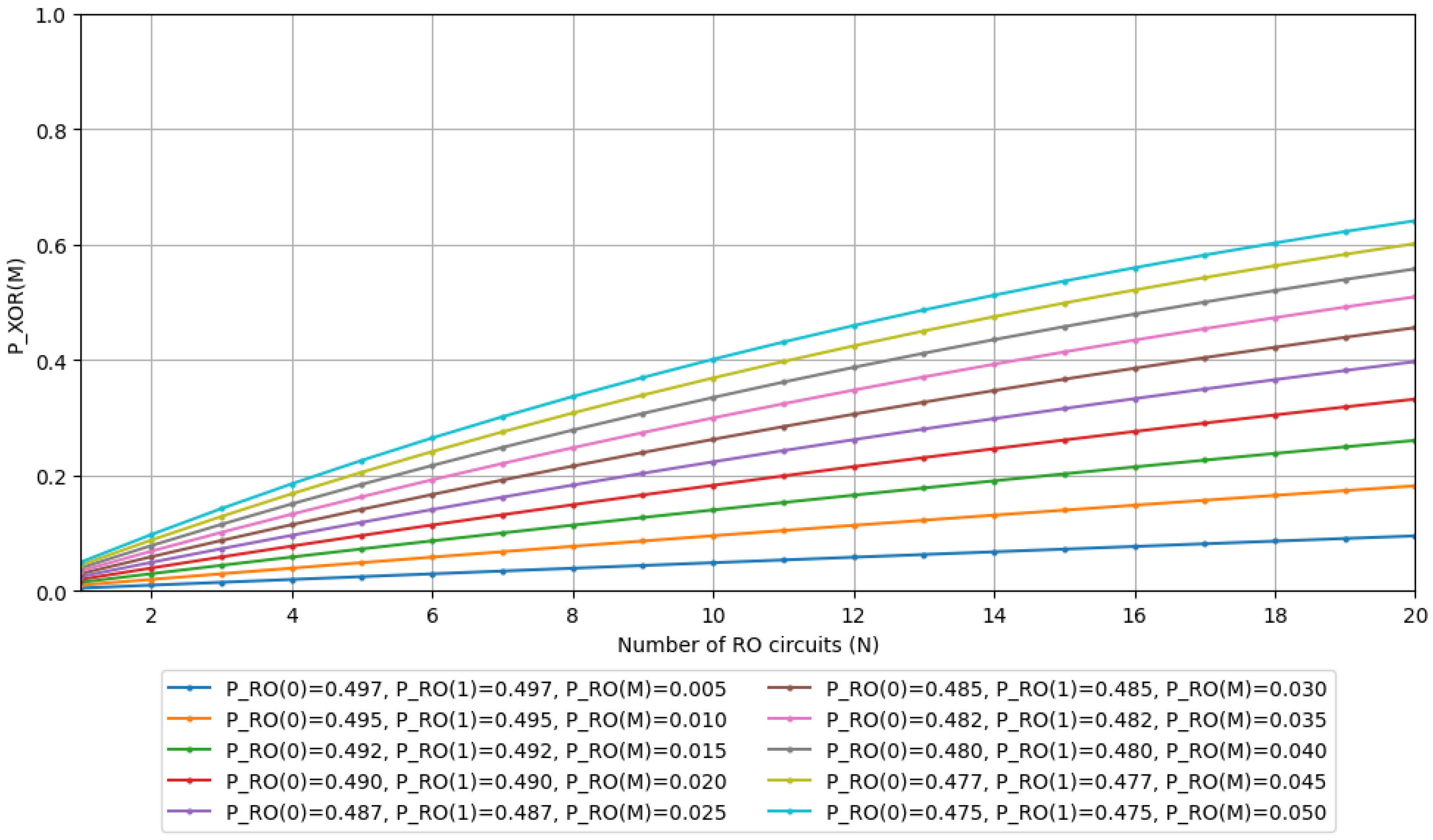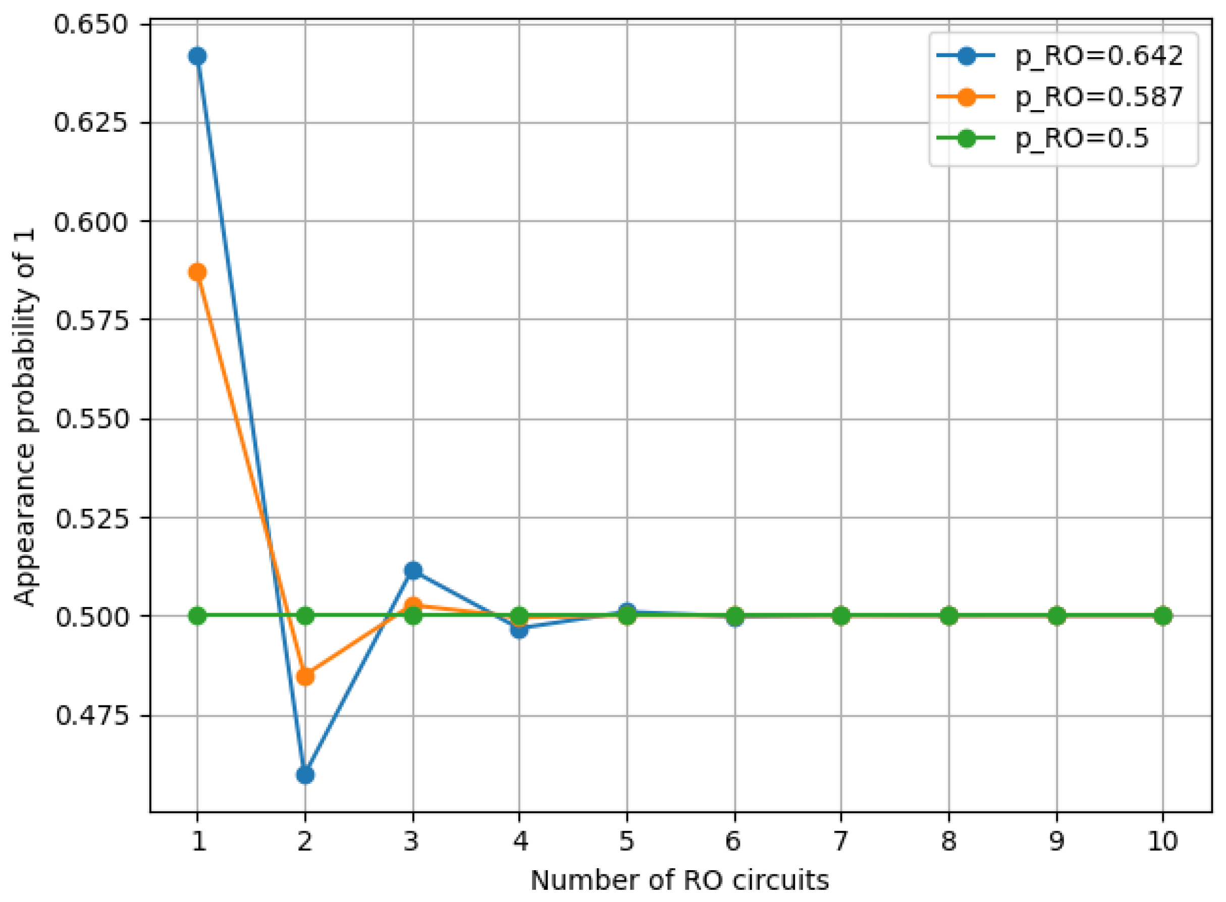 Figure 3 shows the simulation results. As shown in the figure, increasing the number of ROs resulted in the convergence of the probability