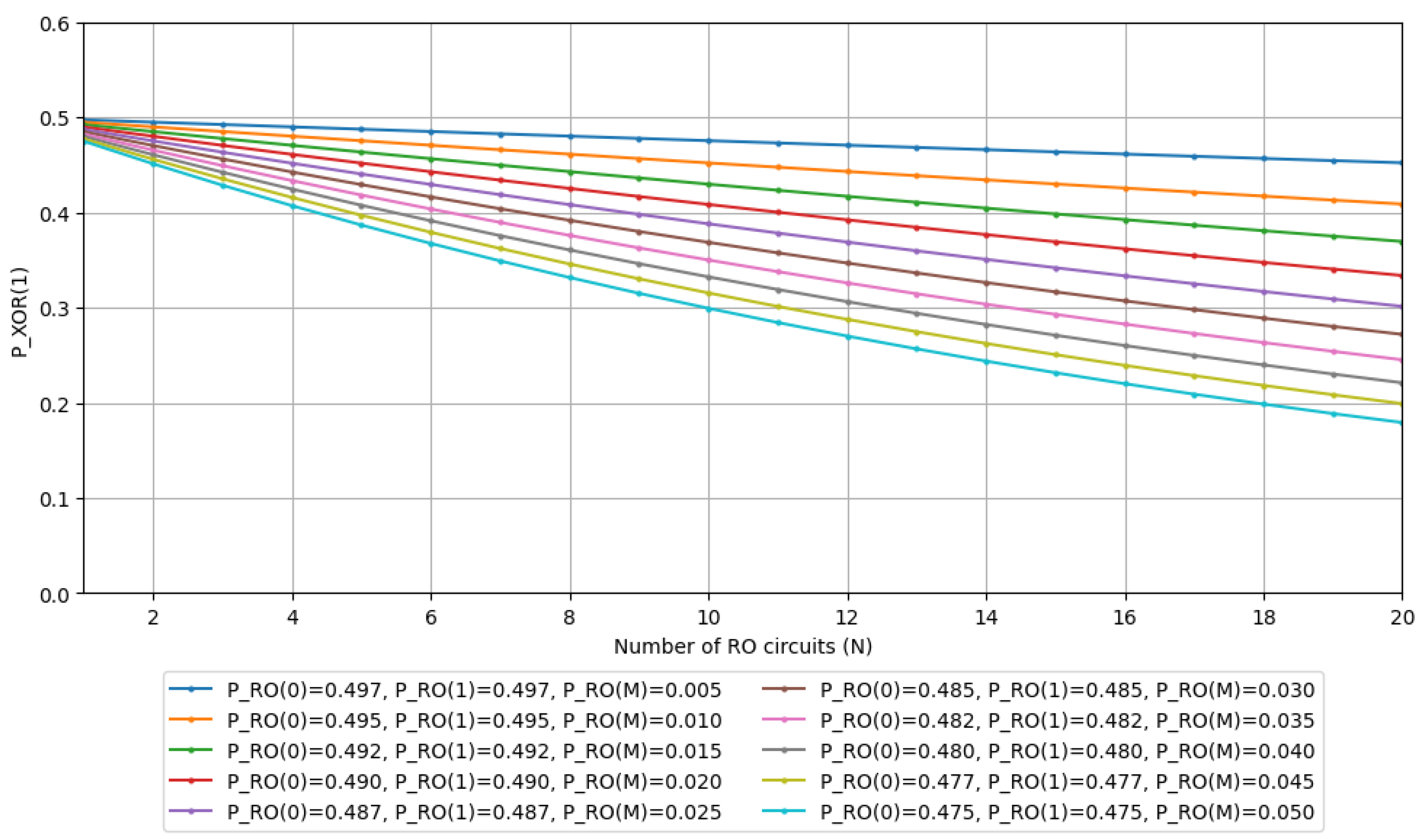 Using these results, we will now examine the probabilities when employing N ROs. The outputs of each XOR gate can be represented as follows: