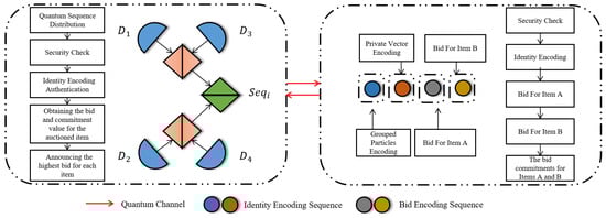 Step 7: Completing these operations, each bidder obtains a unique identity code. Repeating Steps 1–3, HTP generates a new quantum sequence and new for each round r. In each sequence, the first particles encode identity (2 group particles followed by n identity particles). For item w with domain , the next particles encode the bid.