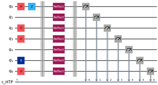 Step 1: HTP randomly generates rotation particles and decoy particles from BB84 state . According to the rules specified in the aforementioned protocol, the quantum sequences , and are formed in Table 3. The quantum circuit diagram for is illustrated in Figure 3 according to the aforementioned conditions. In this simulation, we employ a decoy state ratio of approximately 50% (1:1 with rotation particles) to maximize statistical detection sensitivity for the case study.